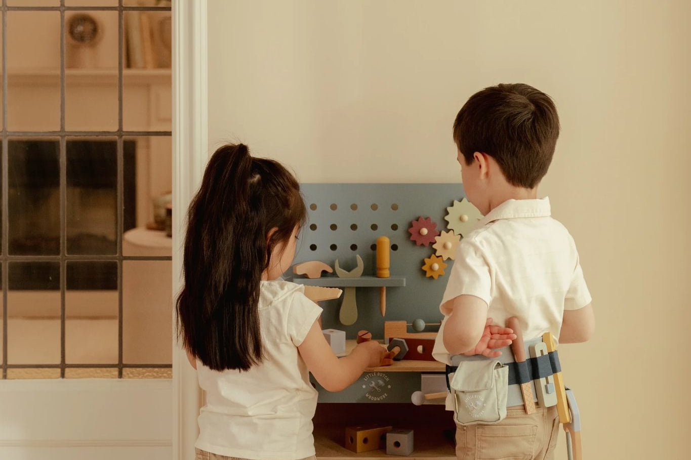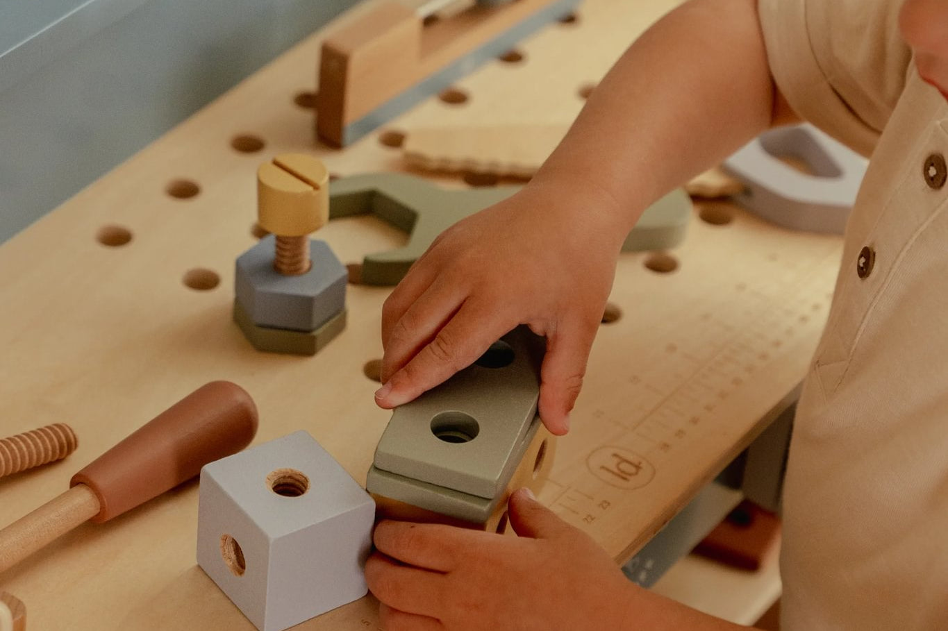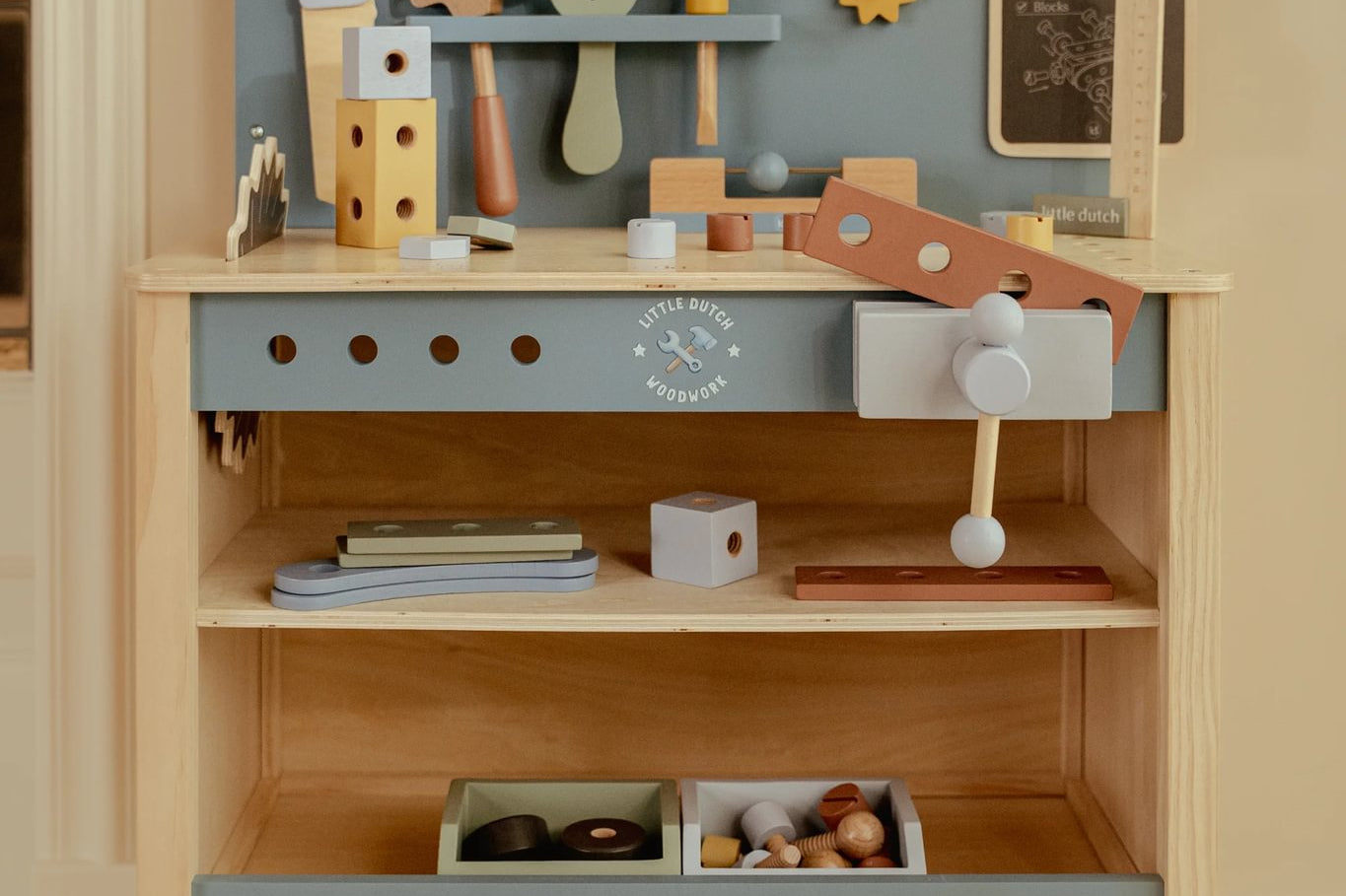 As crianças adoram imitar os pais e esta banca de ferramentas permite-lhes criar e construir objetos como os adultos!