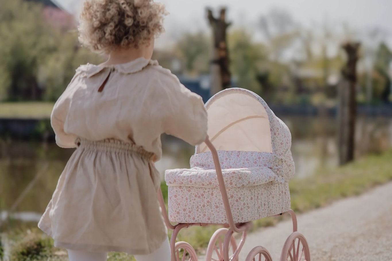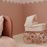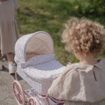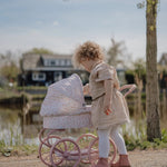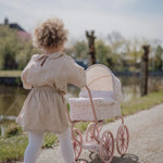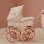 Este encantador carrinho de bonecas tem um estilo vintage e romântico, ideal para minis que adoram brincar e cuidar de seus bebés. Com estrutura metálica pintada em um tom rosa suave, o carrinho é equipado com quatro grandes rodas raiadas, proporcionando estabilidade e um visual clássico.