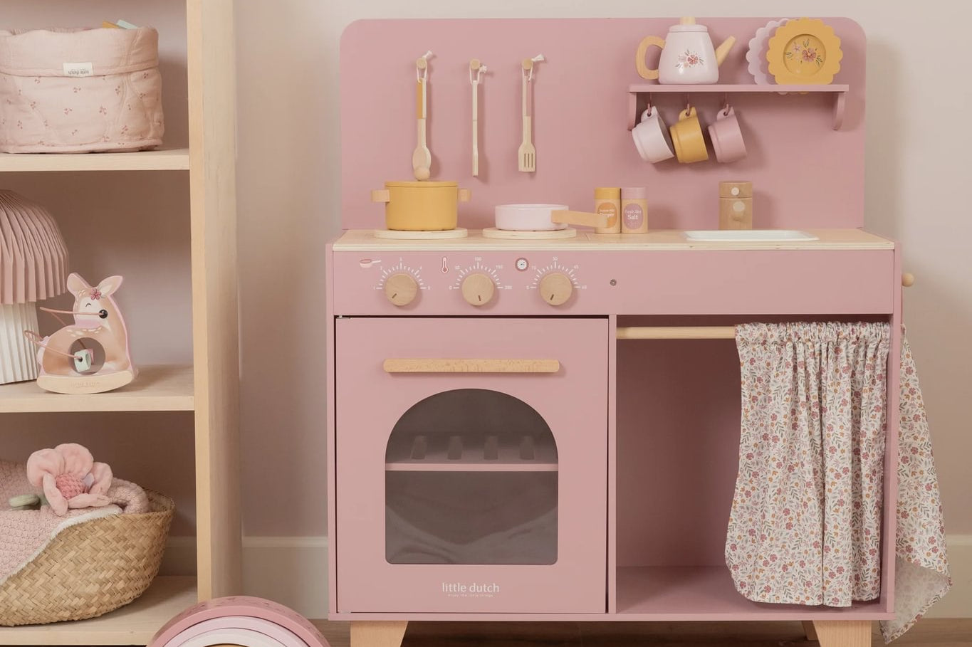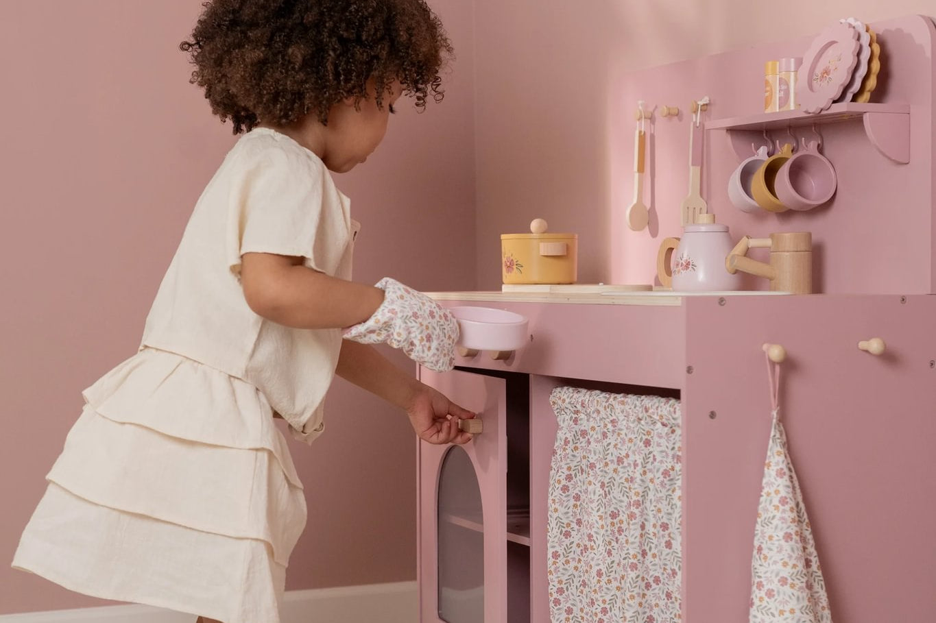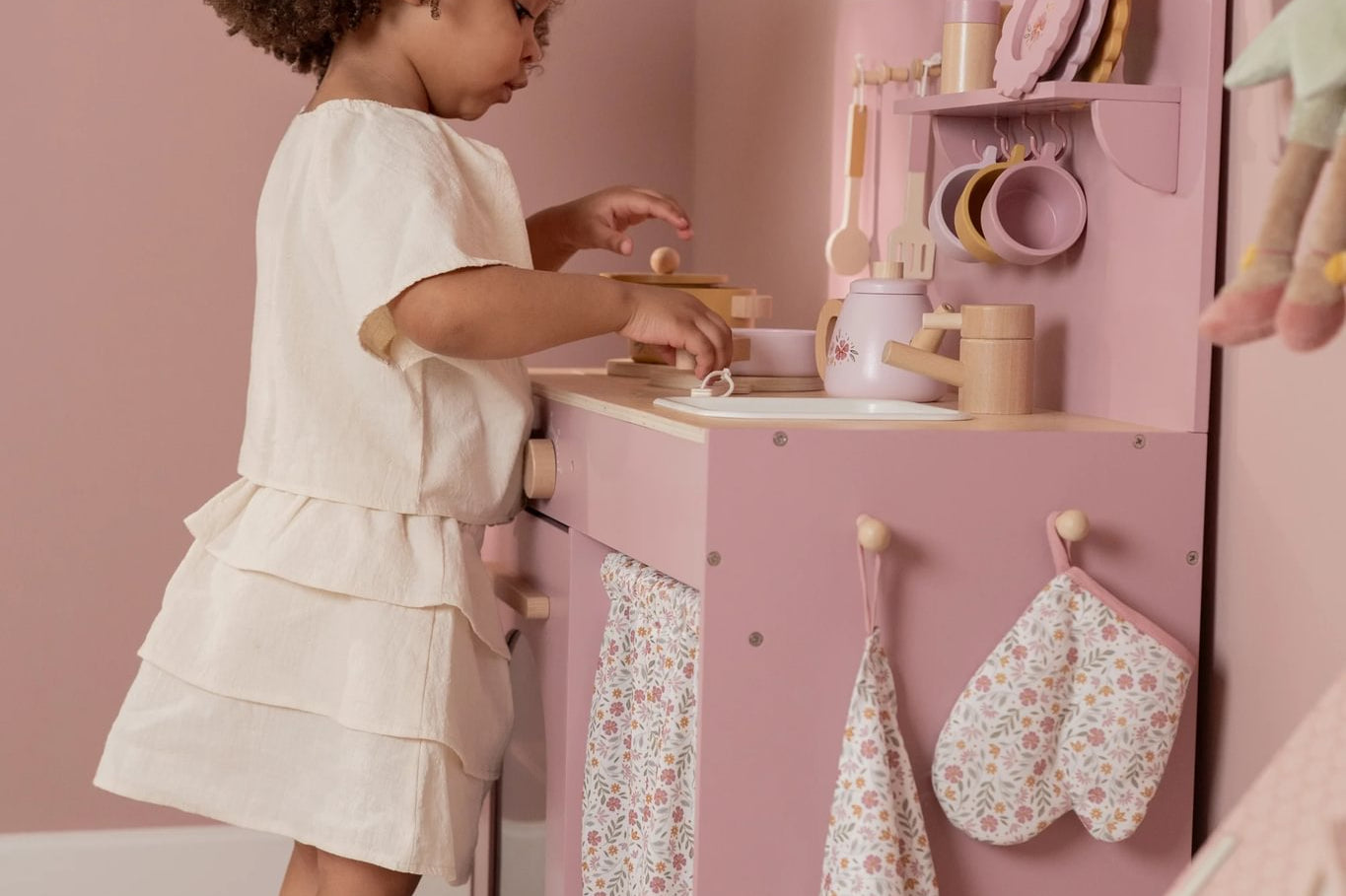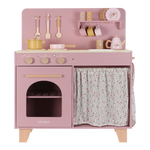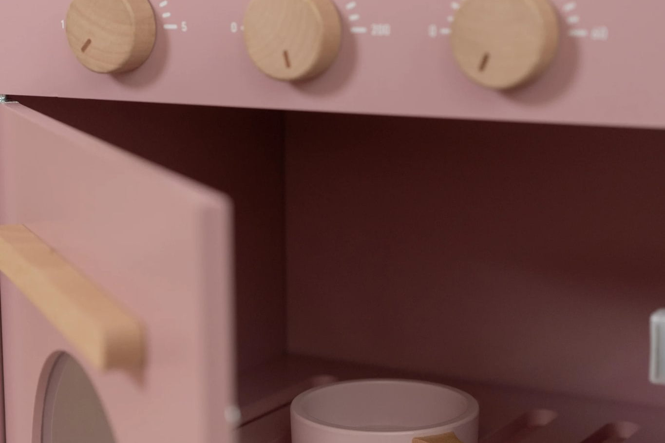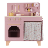 Mini chefs, preparem-se! Com esta cozinha amorosa em madeira, cor de rosa, podem mergulhar no mundo da culinária e da pastelaria. O conjunto inclui duas panelas, utens匀ios de cozinha, três chávenas e três pratos, todos com ilustrações alegres. Coza um bolo no forno ou cozinhe legumes no fogão, que emite um som borbulhante quando coloca uma panela sobre ele. Lave as mãos no lava-loiça e guarde as suas compras no armário. O micro-ondas tem bots verdadeiros com ilustrações e, com o conjunto de sal e pimenta, pode dar um sabor extra a cada prato. A cortina de tecido, o pano de cozinha e a luva de forno são decorados com o estampado suave de Flores Suaves. Uma cozinha de brinquedo encantadora para diversão culinária sem fim!