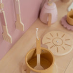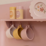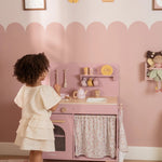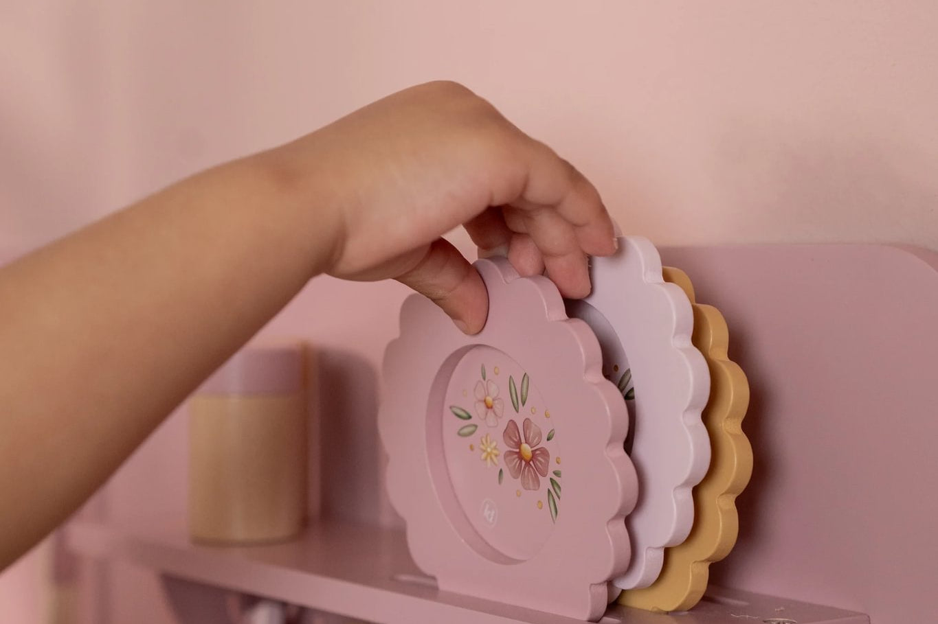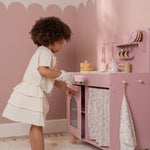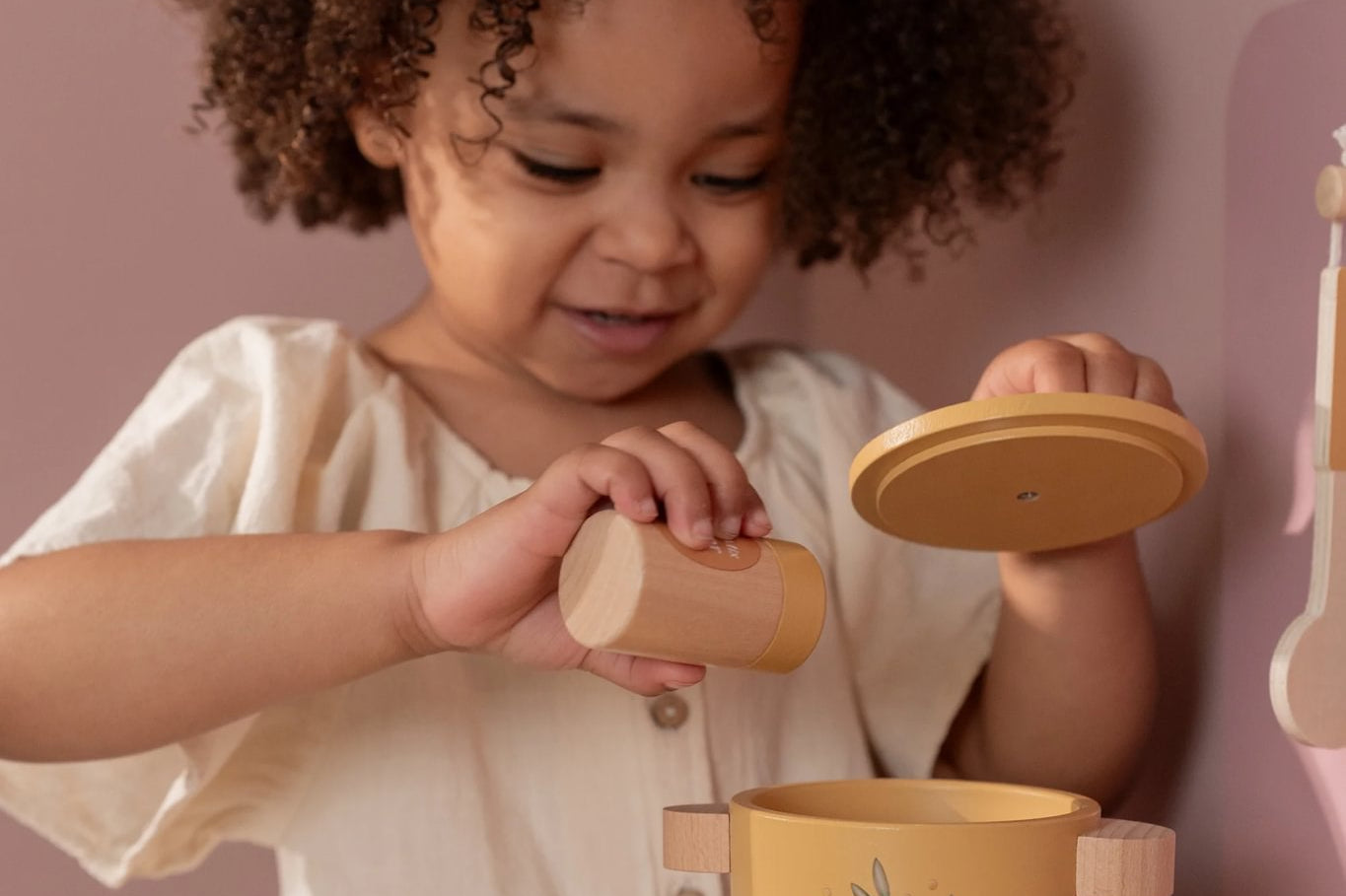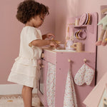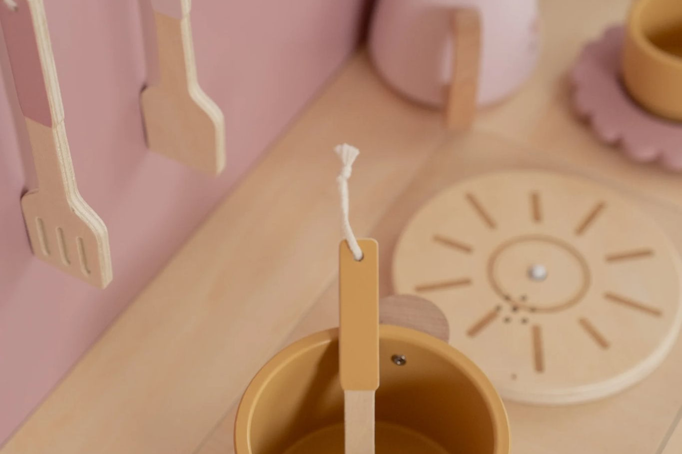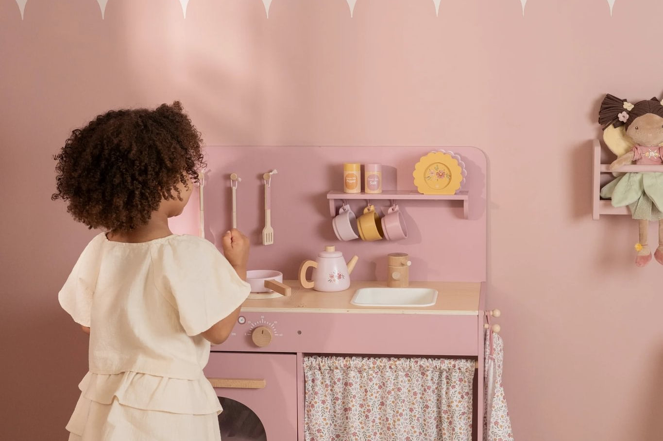Mini chefs, preparem-se! Com esta cozinha amorosa em madeira, cor de rosa, podem mergulhar no mundo da culinária e da pastelaria. O conjunto inclui duas panelas, utens匀ios de cozinha, três chávenas e três pratos, todos com ilustrações alegres. Coza um bolo no forno ou cozinhe legumes no fogão, que emite um som borbulhante quando coloca uma panela sobre ele. Lave as mãos no lava-loiça e guarde as suas compras no armário. O micro-ondas tem bots verdadeiros com ilustrações e, com o conjunto de sal e pimenta, pode dar um sabor extra a cada prato. A cortina de tecido, o pano de cozinha e a luva de forno são decorados com o estampado suave de Flores Suaves. Uma cozinha de brinquedo encantadora para diversão culinária sem fim!
