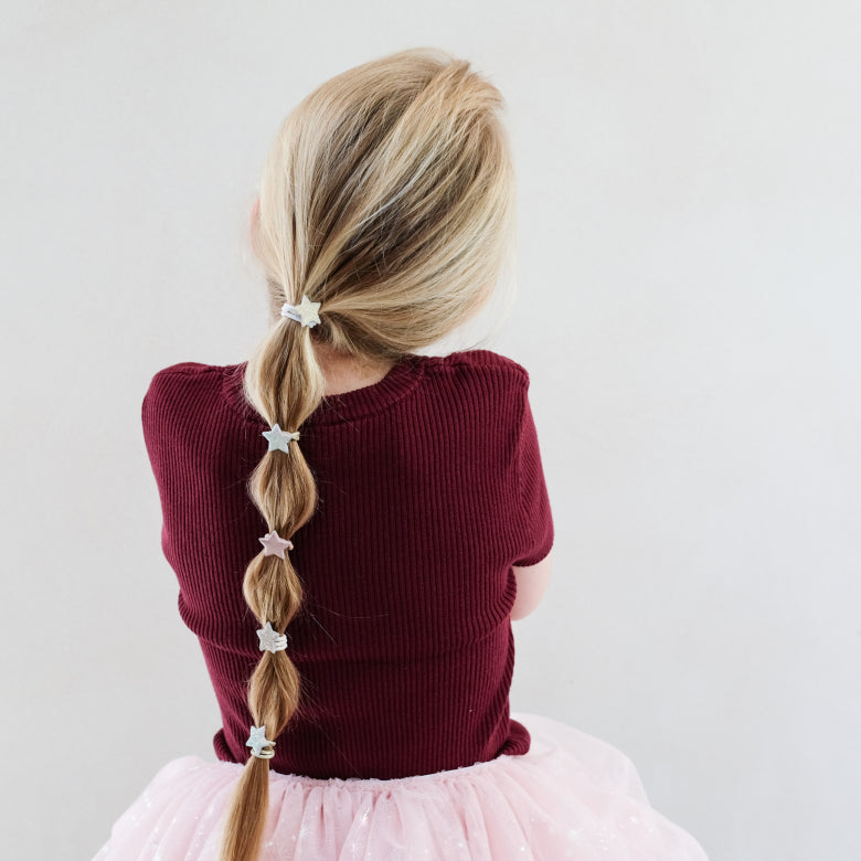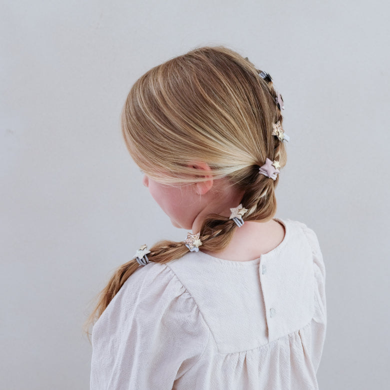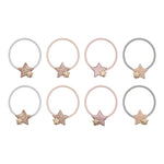 Este conjunto de oito fofos elásticos de cabelo com estrelas, vão dar um toque de magia ao look do seu mini! São perfeitos para minis que adoram brilho.