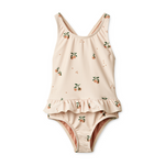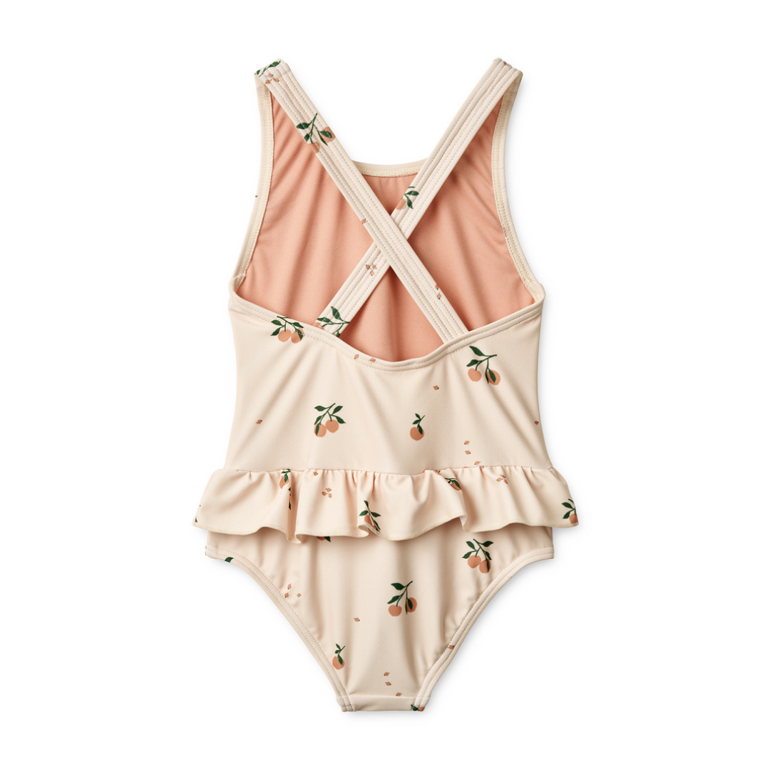 Este amoroso fato de banho Amara, com pêssegos, para além de confortável, tem um design simples e proteção UV 40+ para que o seu mini possa brincar na praia ou piscina com a máxima segurança.