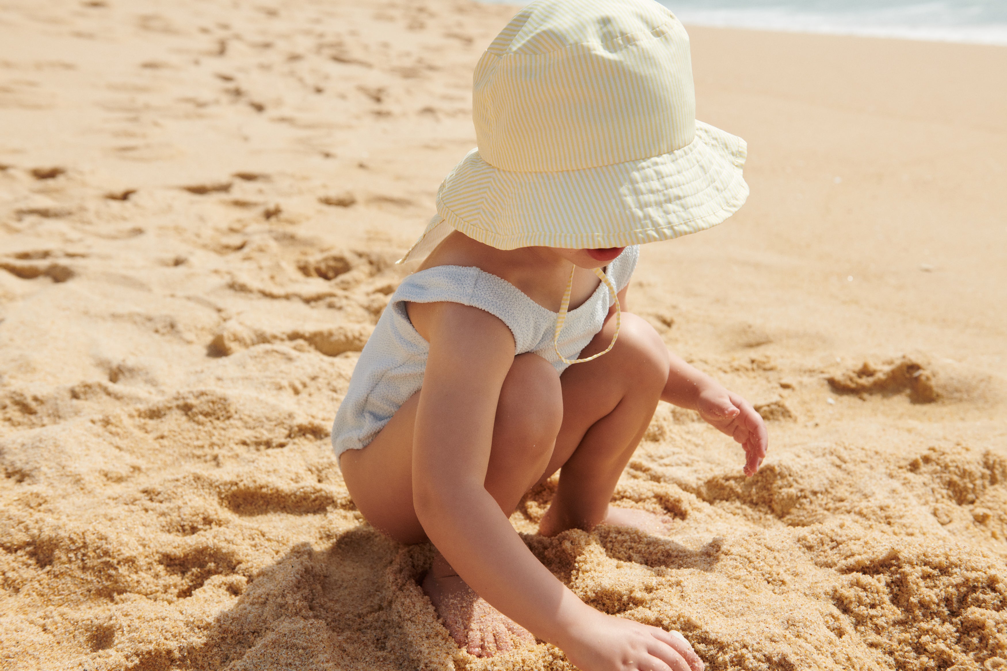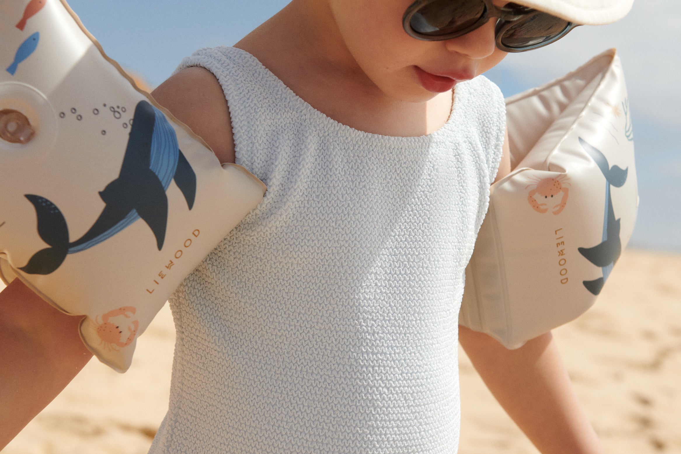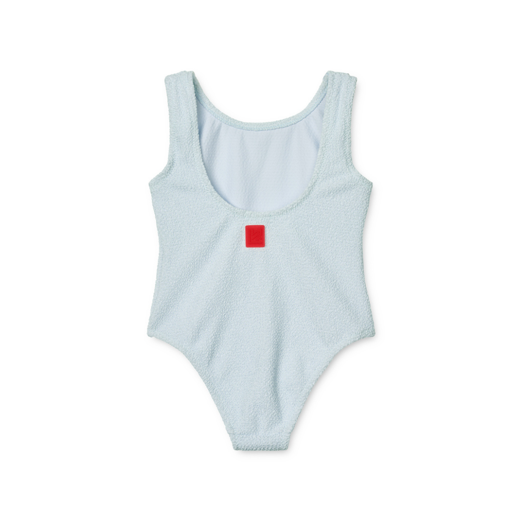 Este amoroso fato de banho Bianco , de cor suave, para além de confortável, tem um design simples e proteção UV 40+ para que o seu mini possa brincar na praia ou piscina com a máxima segurança.