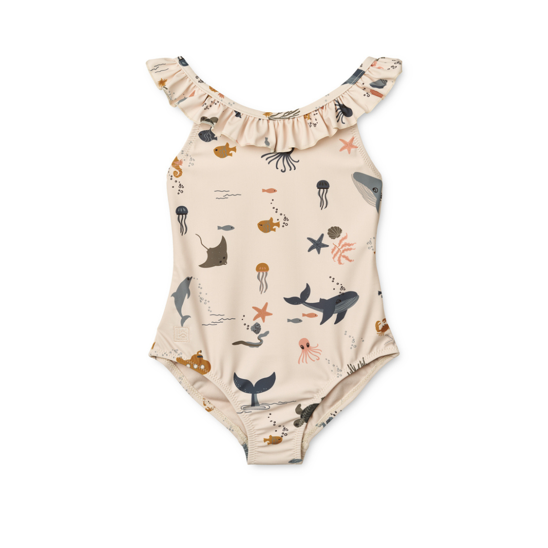 Este amoroso fato de banho Kallie , com criaturas marinhas, para além de confortável, tem um design simples e proteção UV 40+ para que o seu mini possa brincar na praia ou piscina com a máxima segurança!