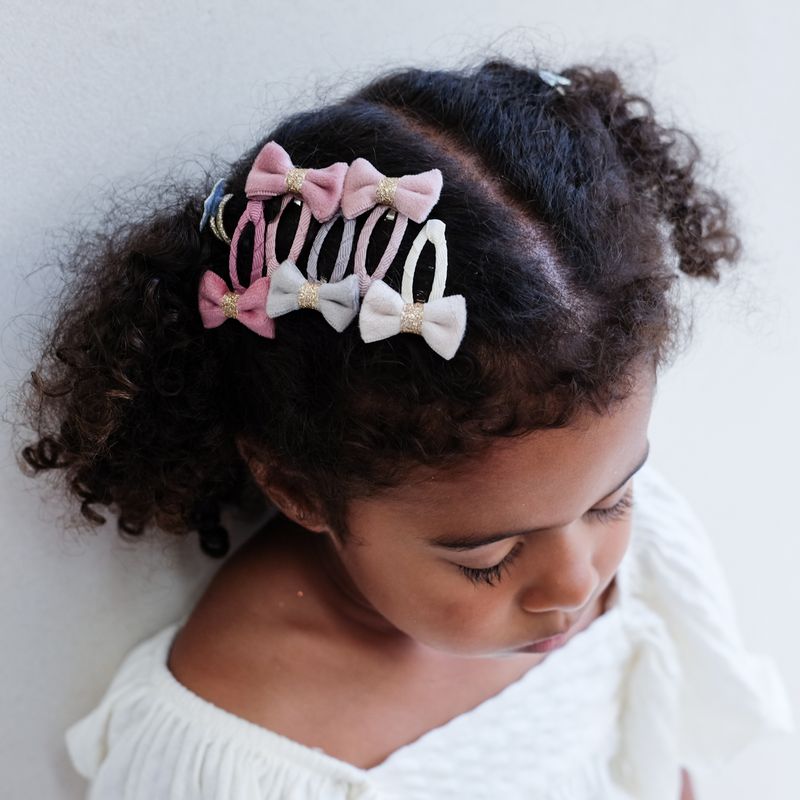 Feitos do veludo mais macio, estes encantadores mini clic-clacs com laços de veludo da Tinkerbell brilham com um envoltório dourado metálico no centro. Disponíveis em encantadores tons de rosa suave, cinzento e creme. Use um ou combine vários para um look divertido e elegante que ilumina qualquer penteado.