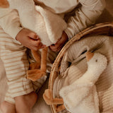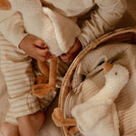 Um grande amigo fofinho para mini exploradores. O Pequeno Ganso é macio, carinhoso e sempre pronto para uma aventura. Super macio e fofo e asas abertas, ele vai se sentir em casa em qualquer lugar, do quarto de bebé a uma viagem. Perfeito para se aconchegar, brincar e se aconchegar sem parar. Um companheiro leal para o dia e a noite!