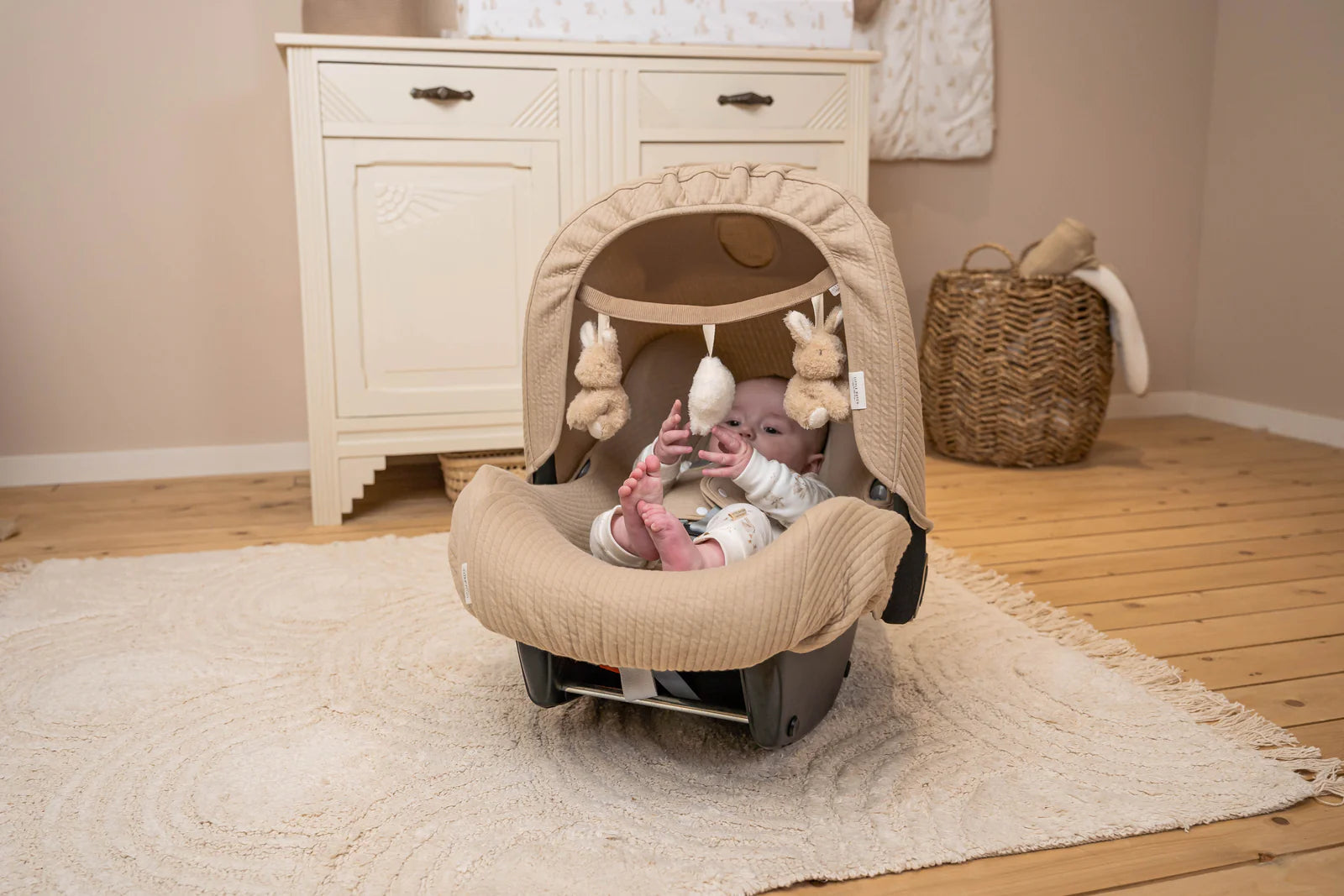 Esta grinalda Baby Bunny para além amorosa também convida à brincadeira. Os coelhos e a estrela, da Little Dutch, tem cada uma característica a explorar. Encontre o som do chocalho ou a estrela! Prenda facilmente o brinquedo ao assento do carro e seu filho ficará entretido quando estiver a passear.