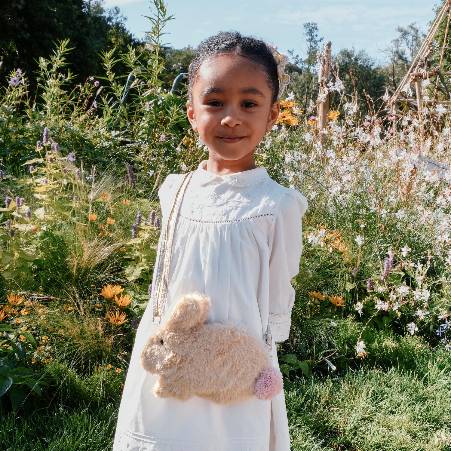 Esta bonita mala em forma de coelhinho é feita de macio tecido e com um pompom rosa. Tem um fecho magnético e uma alça ajustável.