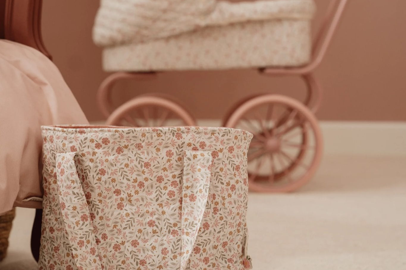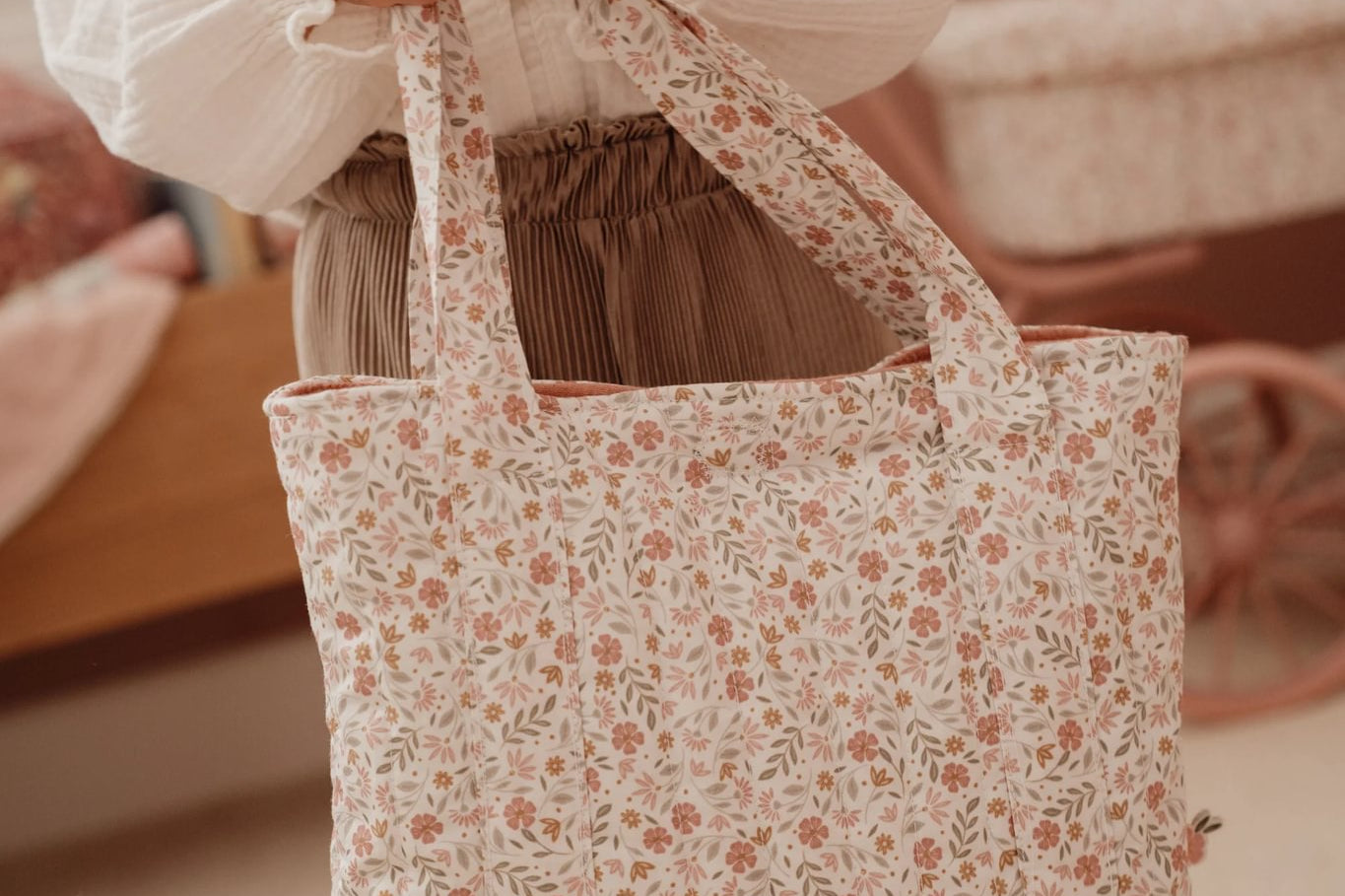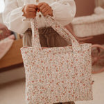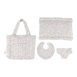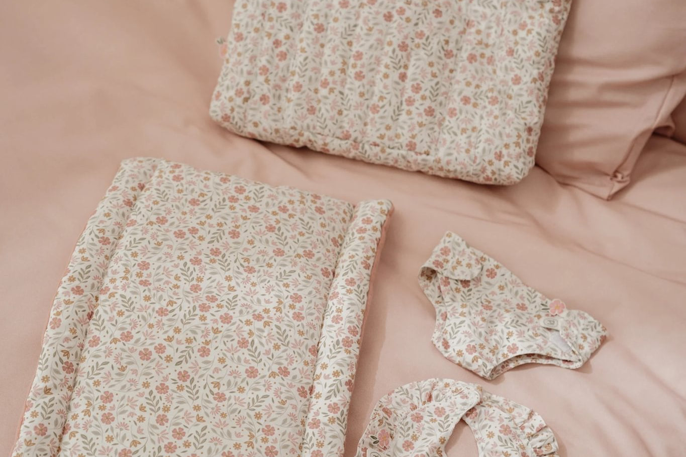 Todos os itens são confeccionados em tecido macio com um padrão floral delicado em tons suaves de rosa, verde e bege, combinando com um estilo natural, doce e encantador.
