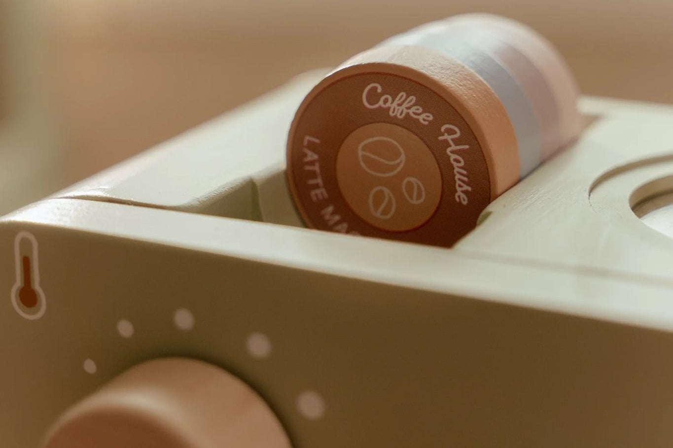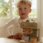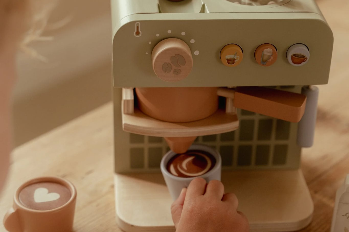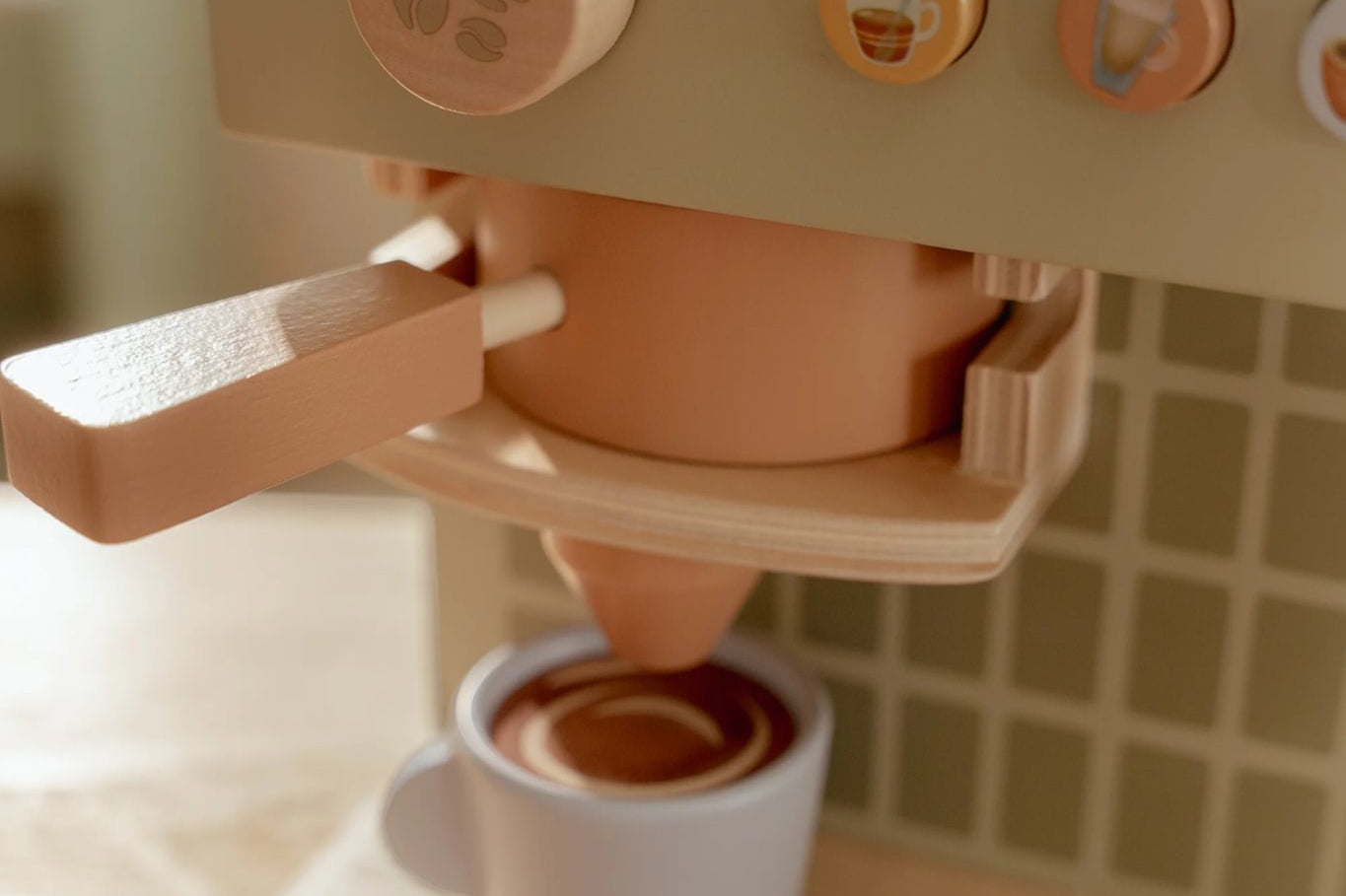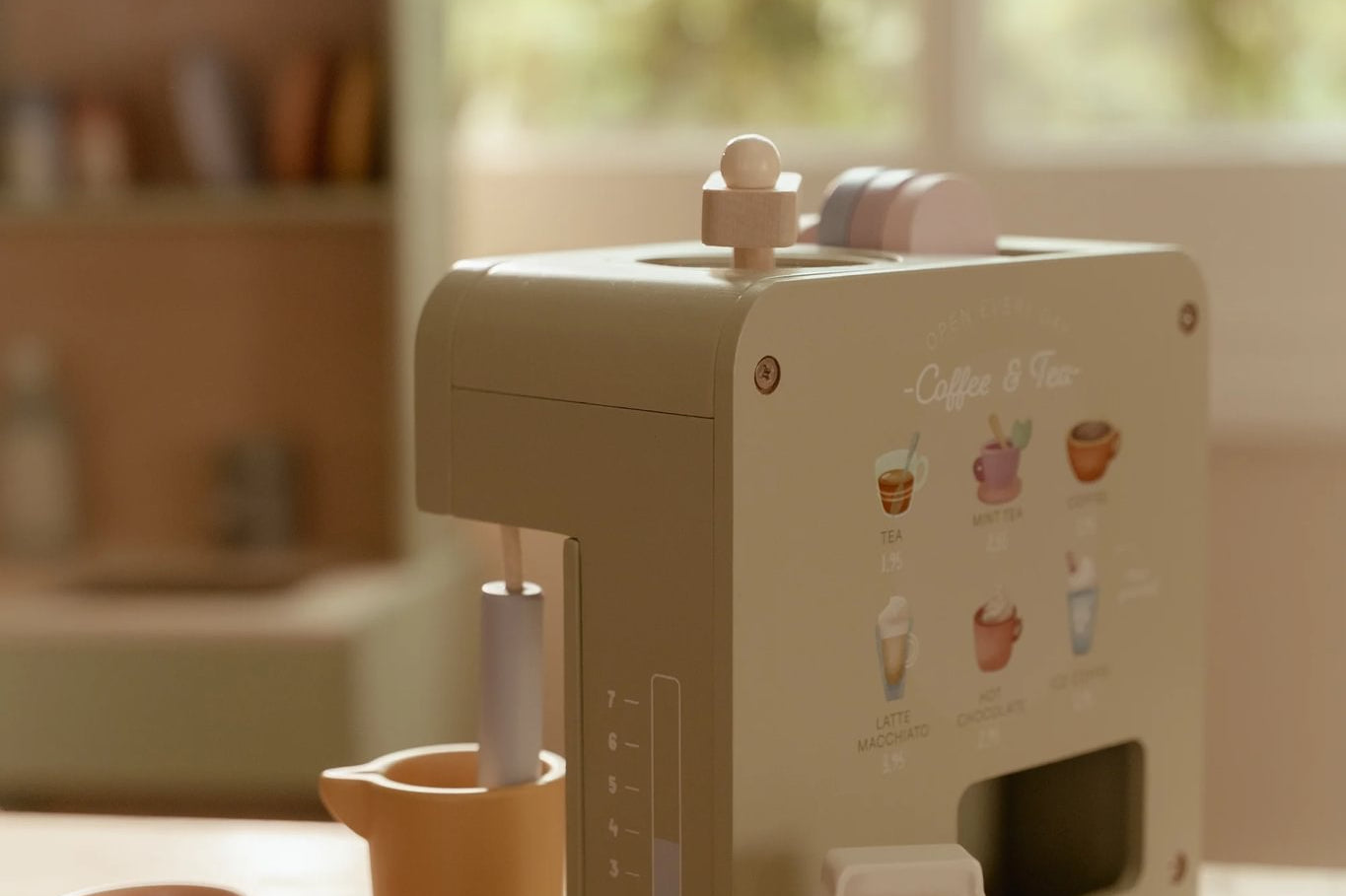 Hora de uma deliciosa chávena de café ou chá! Com esta cafeteira de madeira, os pequenos baristas podem moer grãos, inserir cápsulas de café e mexer a bebida com uma colher. O conjunto inclui duas chávenas, duas colheres, um jarro de leite, pacotes de leite e até stencils de cappuccino para uma verdadeira experiência de café. A parte traseira da máquina apresenta bonitas ilustrações. Perfeito para combinar com o cantinho do café de brincar para ainda mais diversão! Prefere um café ou chá hoje?