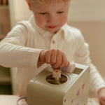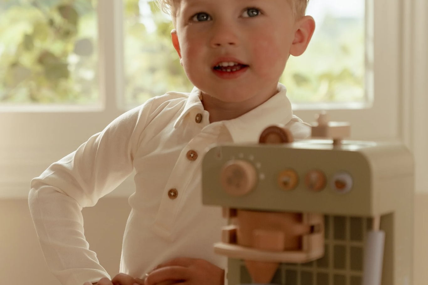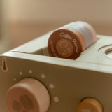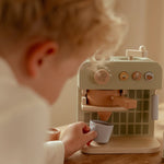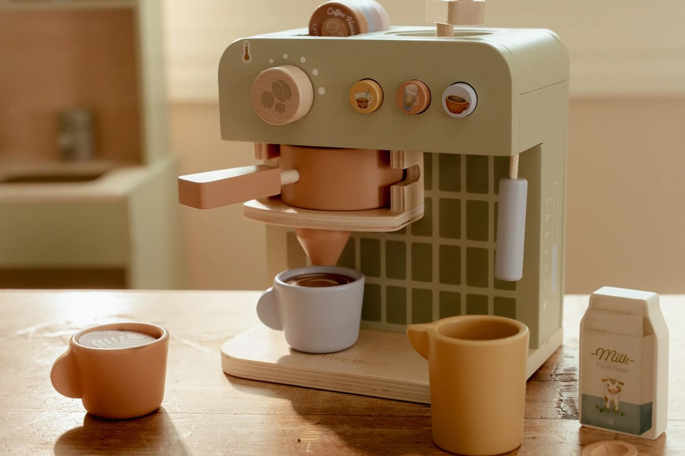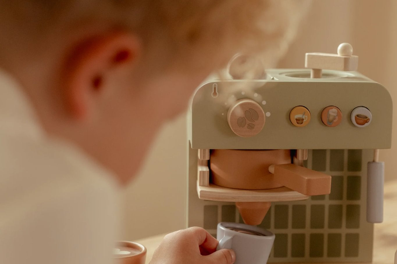 Hora de uma deliciosa chávena de café ou chá! Com esta cafeteira de madeira, os pequenos baristas podem moer grãos, inserir cápsulas de café e mexer a bebida com uma colher. O conjunto inclui duas chávenas, duas colheres, um jarro de leite, pacotes de leite e até stencils de cappuccino para uma verdadeira experiência de café. A parte traseira da máquina apresenta bonitas ilustrações. Perfeito para combinar com o cantinho do café de brincar para ainda mais diversão! Prefere um café ou chá hoje?
