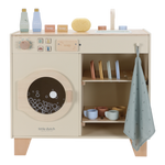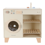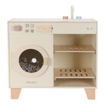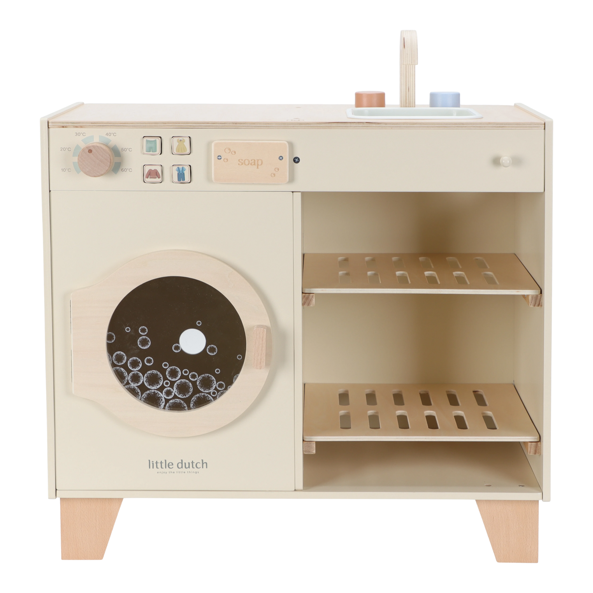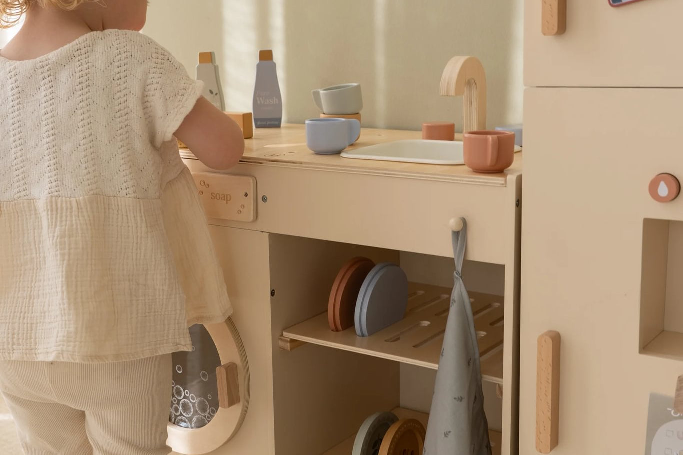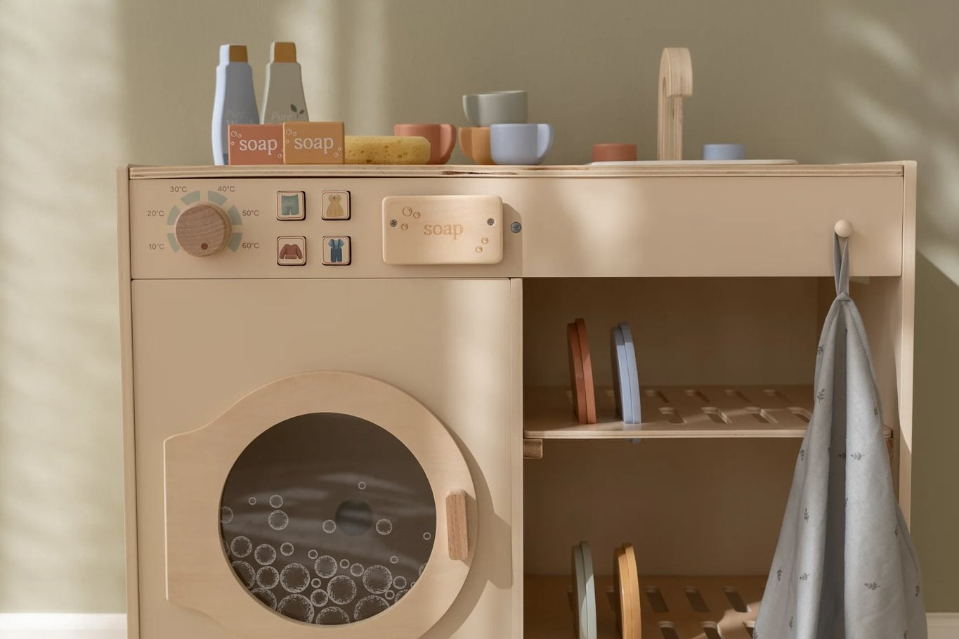 Com esta máquina de lavar roupa e lava-louças de madeira, as tarefas domésticas vão se transformar numa verdadeira aventura. O conjunto inclui quatro chávenas, quatro pires, dois pratos, detergente, sabão em barra e um pano de prato. Lave a louça na banca e trate das roupinhas da boneca na máquina de lavar. Os botões realistas com ilustrações e o compartimento especial para o sabão em barra tornam a brincadeira ainda mais divertida. Combine a máquina de lavar roupa e a lava-louças com o conjunto de cozinha de brinquedo e frigorífico para criar um cantinho de cozinha completo. Diversão sem fim para os mini heróis da casa!