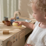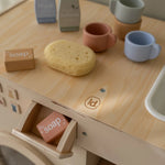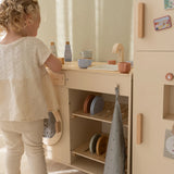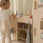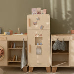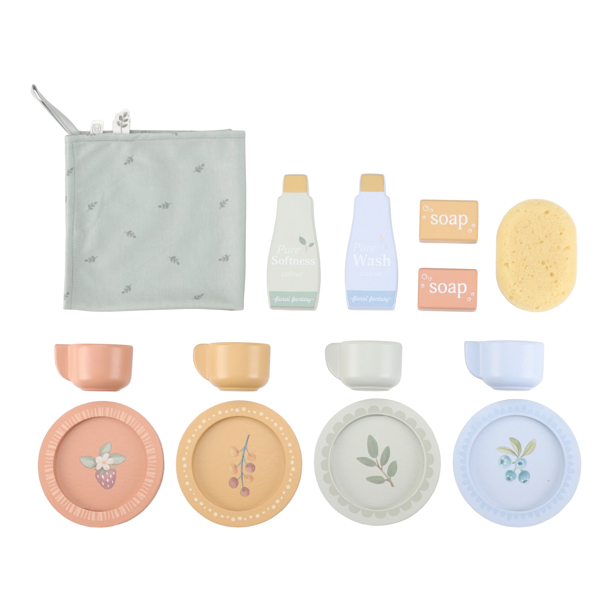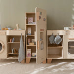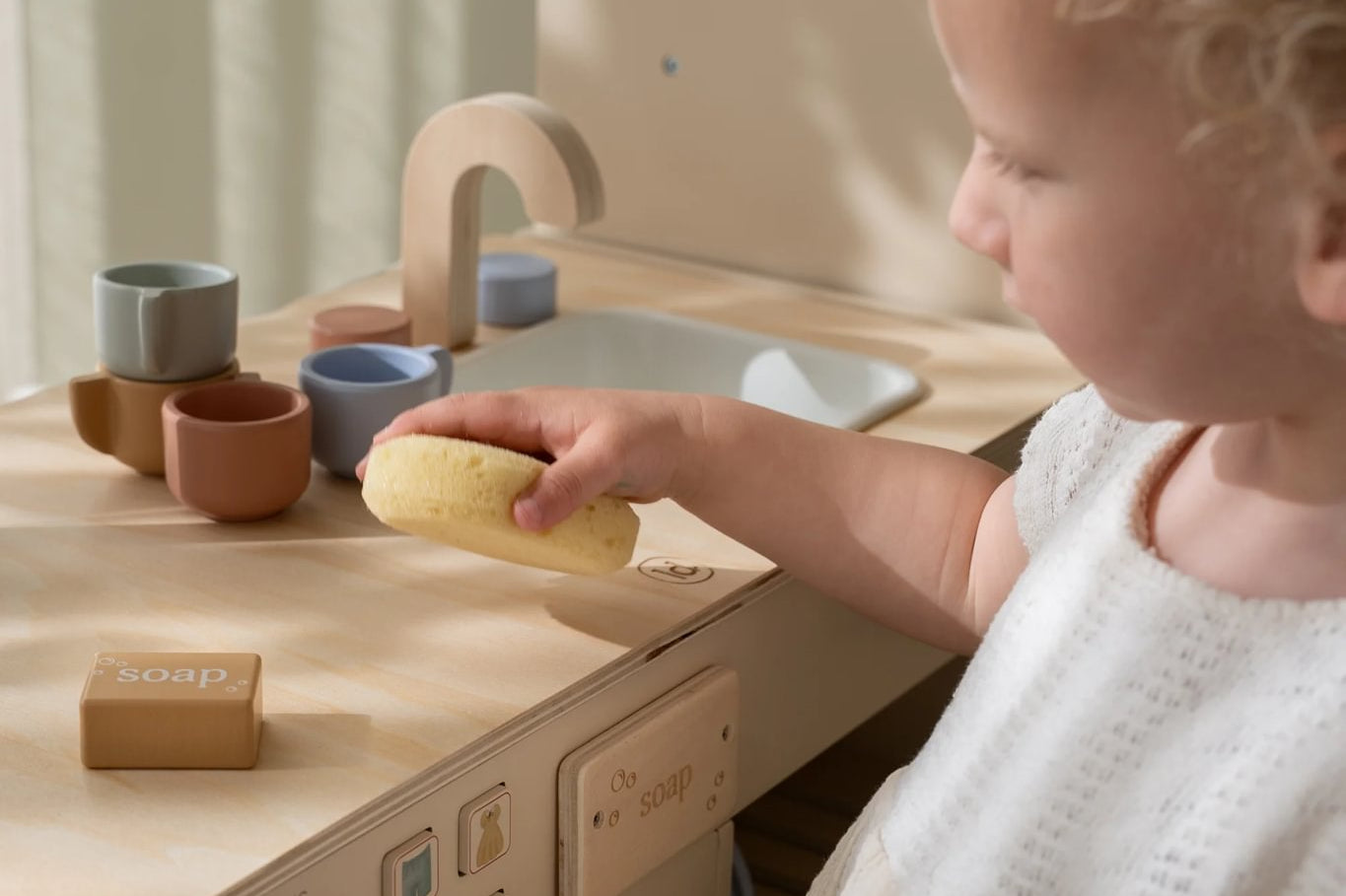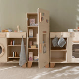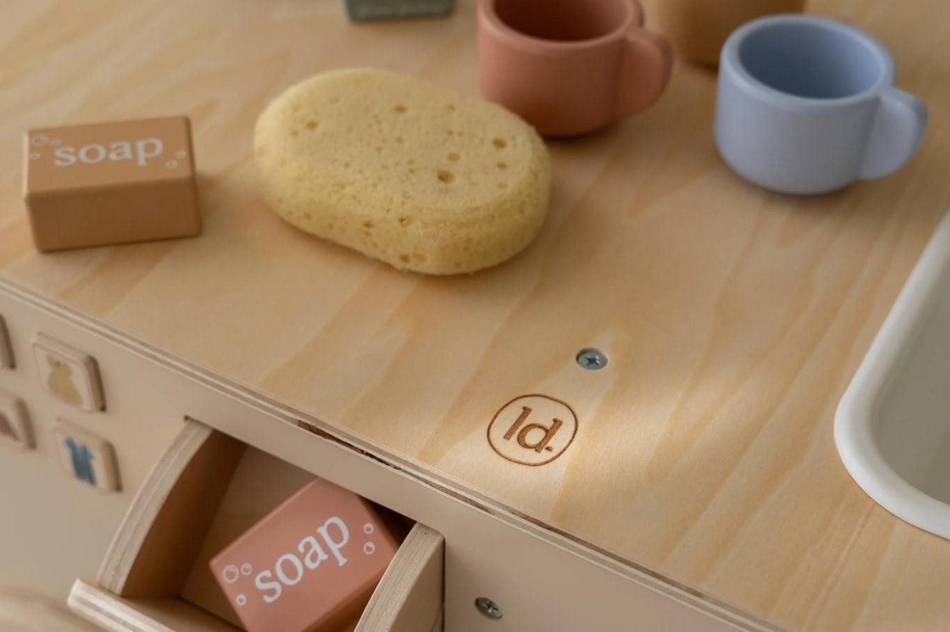 Com esta máquina de lavar roupa e lava-louças de madeira, as tarefas domésticas vão se transformar numa verdadeira aventura. O conjunto inclui quatro chávenas, quatro pires, dois pratos, detergente, sabão em barra e um pano de prato. Lave a louça na banca e trate das roupinhas da boneca na máquina de lavar. Os botões realistas com ilustrações e o compartimento especial para o sabão em barra tornam a brincadeira ainda mais divertida. Combine a máquina de lavar roupa e a lava-louças com o conjunto de cozinha de brinquedo e frigorífico para criar um cantinho de cozinha completo. Diversão sem fim para os mini heróis da casa!