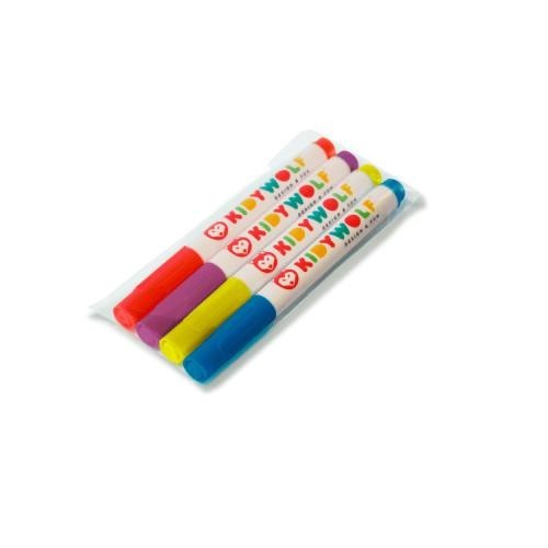 Este amoroso pack de quatro marcadores de diferentes cores para além de serem apagáveis, dão para desenhar quadro KIDYDRAW-PRO. Apresentam um efeito neon que vai realçar as cores dos desenhos dos minis durante a noite.
