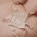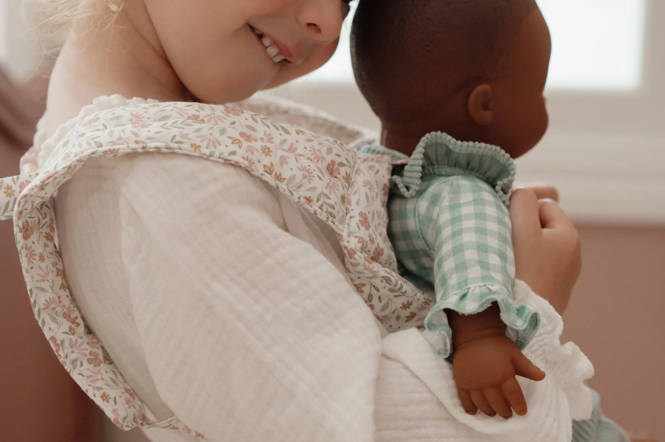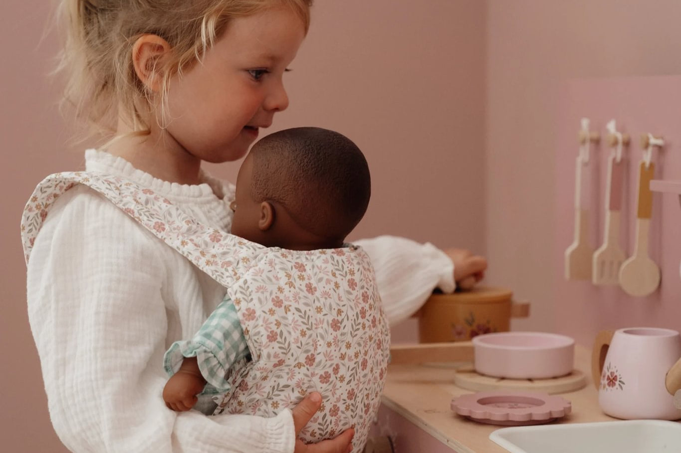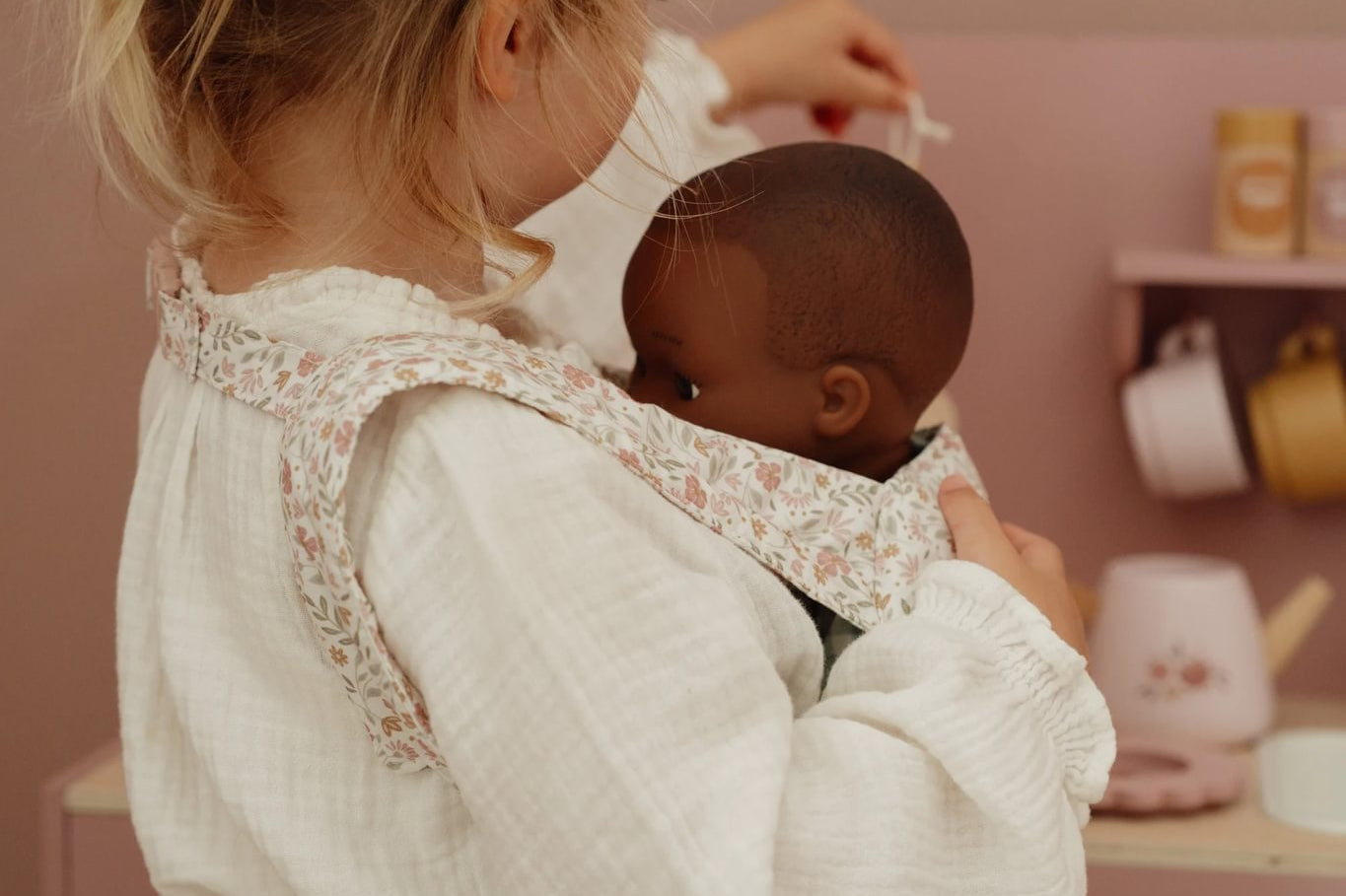 Este adorável marsúpio de brincar foi criado especialmente para minis que gostam de cuidar e imitar os adultos. Feito em tecido suave e confortável, apresenta um padrão encantador de flores em tons suaves de rosa, verde e bege, criando um visual delicado e acolhedor.