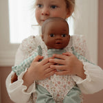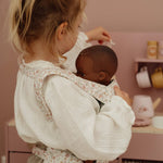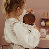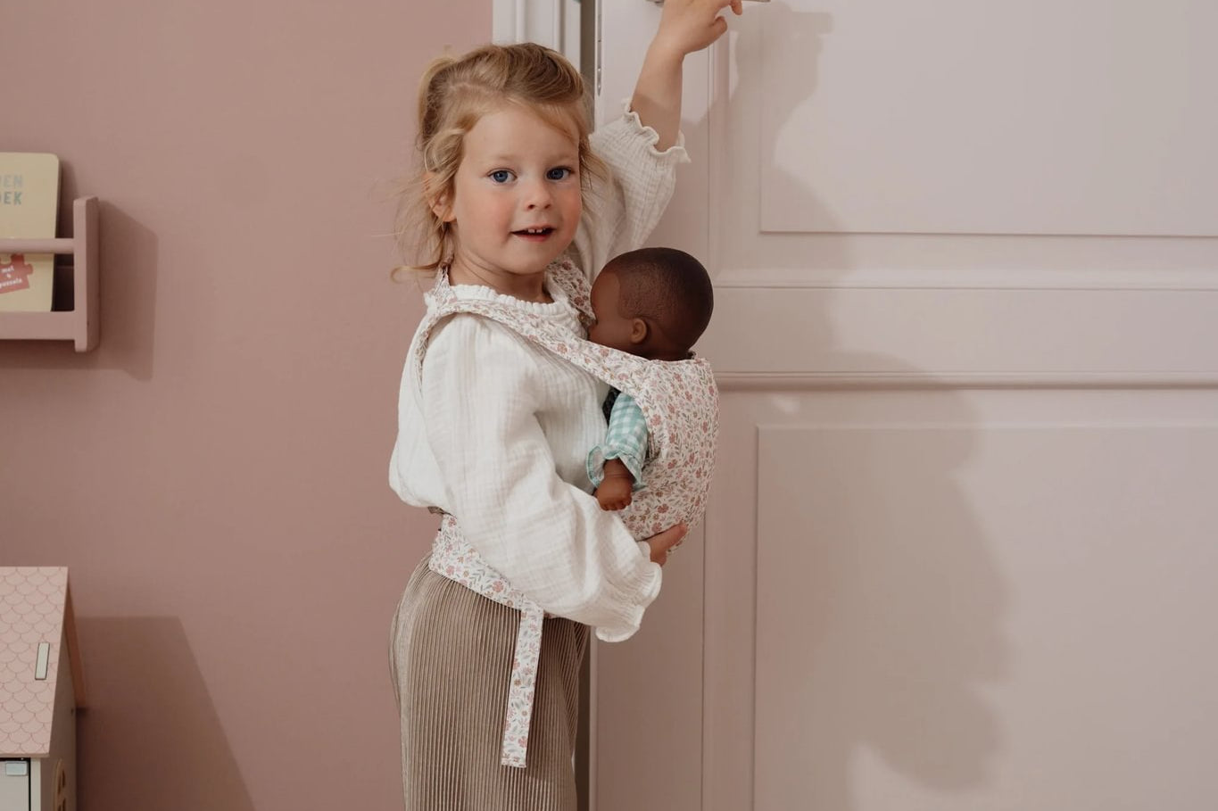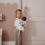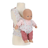 O porta-bebés ajusta-se facilmente com laços à volta da cintura e dos ombros da criança, permitindo que as bonecas fiquem bem seguras e confortáveis, tal como um bebé verdadeiro.