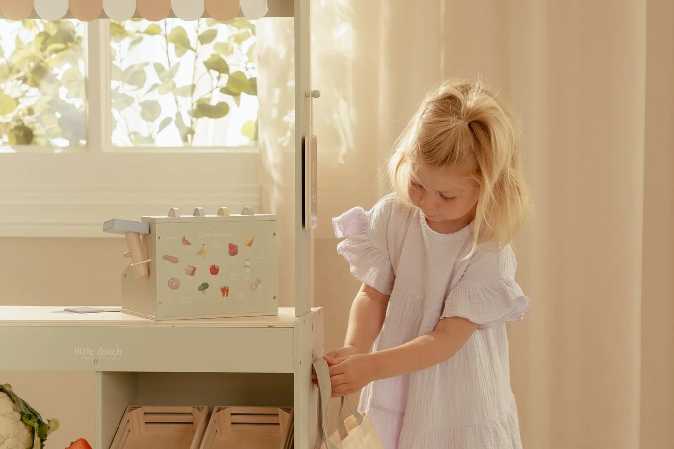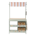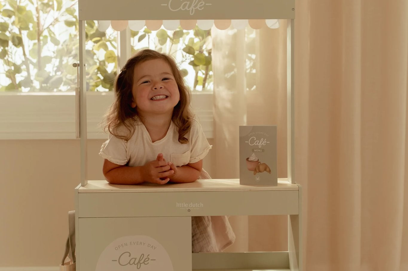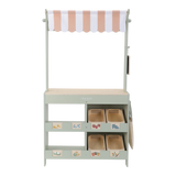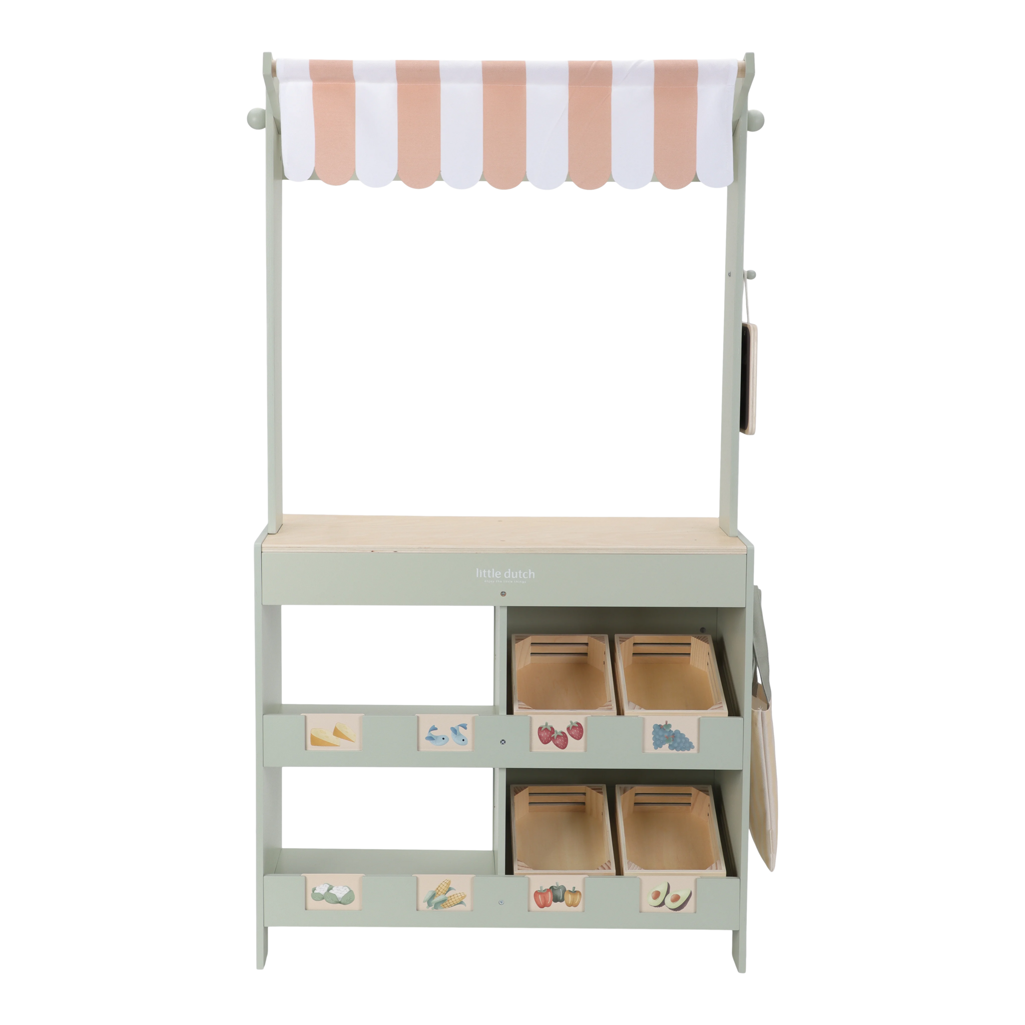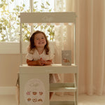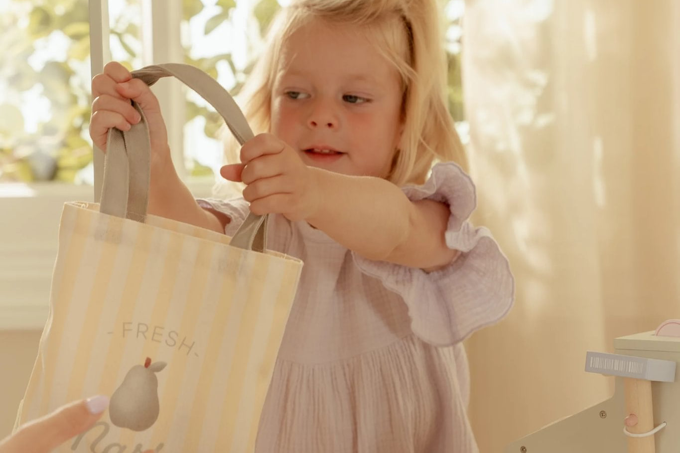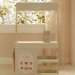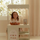 Com este mercado em madeira, os minis vão dar asas à imaginação e brincar às compras na sua própria lojinha. A cobertura de tecido cria uma atmosfera autêntica de mercado e, com o quadro e os cartões ilustrados, vão conseguir expor os seus produtos de forma elegante. O conjunto inclui ainda um saco de compras e caixas para uma verdadeira experiência de mercado e se virar a tenda transforma-se num café completo com um menu e ilustrações alegres.