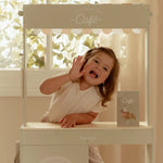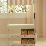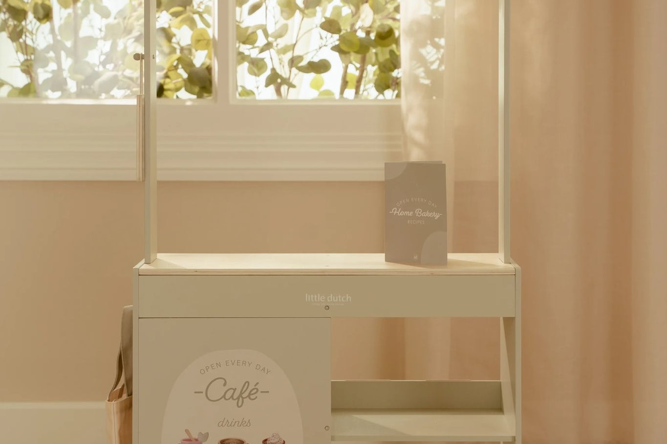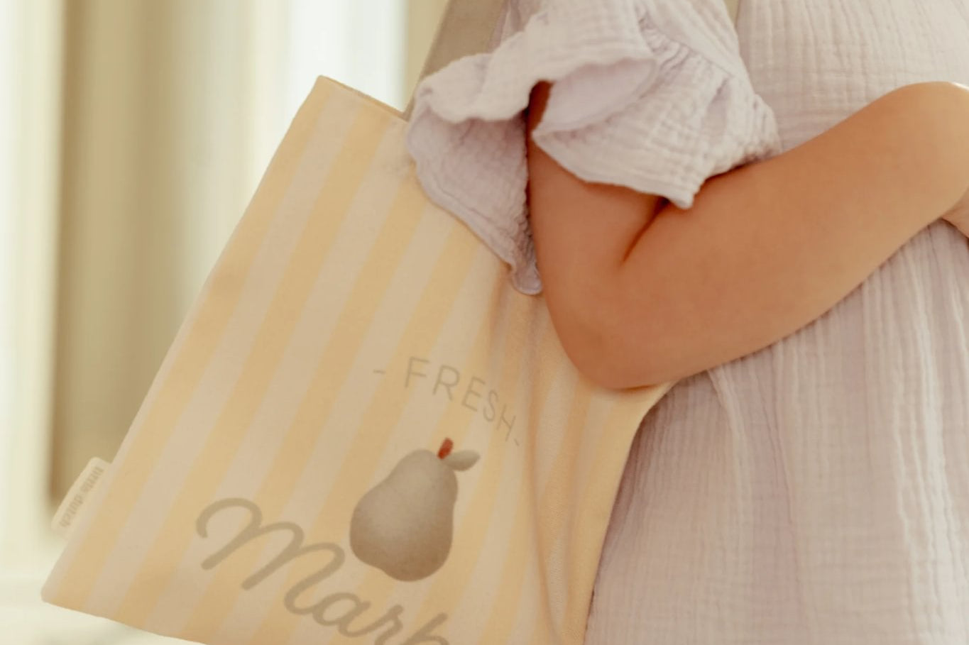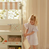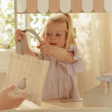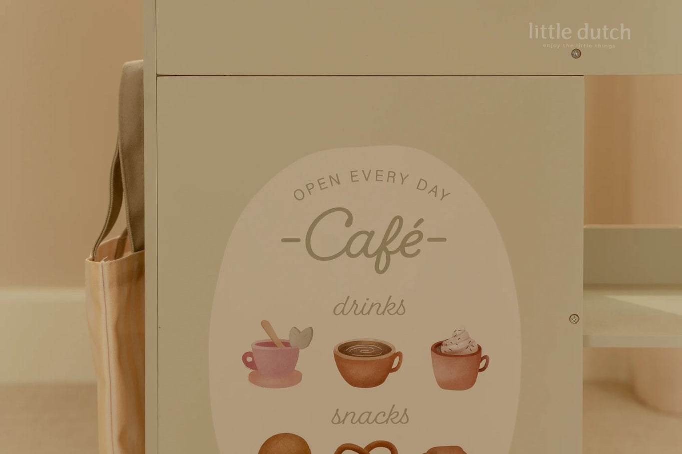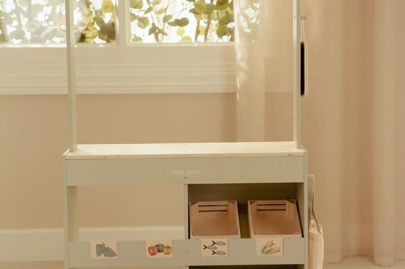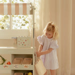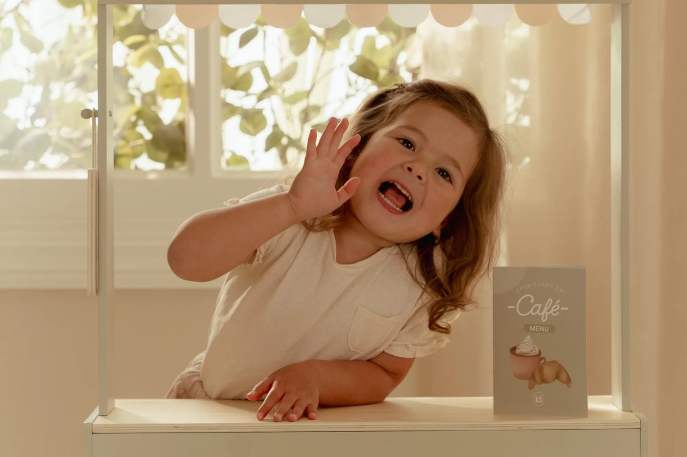 Com este mercado em madeira, os minis vão dar asas à imaginação e brincar às compras na sua própria lojinha. A cobertura de tecido cria uma atmosfera autêntica de mercado e, com o quadro e os cartões ilustrados, vão conseguir expor os seus produtos de forma elegante. O conjunto inclui ainda um saco de compras e caixas para uma verdadeira experiência de mercado e se virar a tenda transforma-se num café completo com um menu e ilustrações alegres.