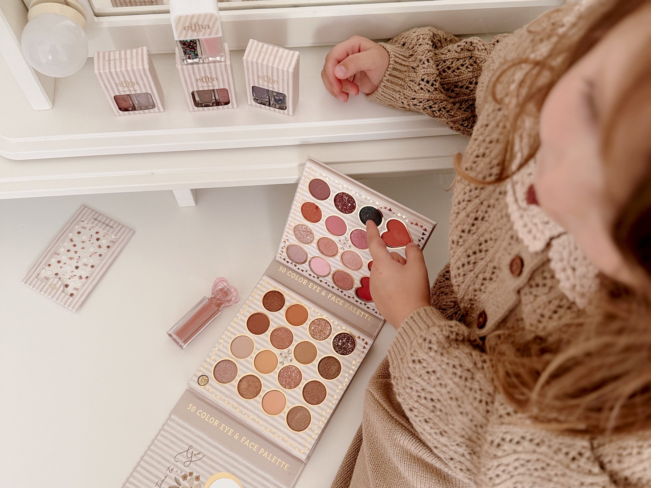 A caixa compacta inclui um espelho embutido e um mini pincel para sombra para uma aplicação fácil e sem sujar. Leve e fácil de transportar, é perfeita para brincadeiras.