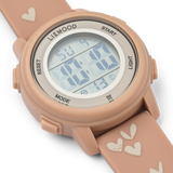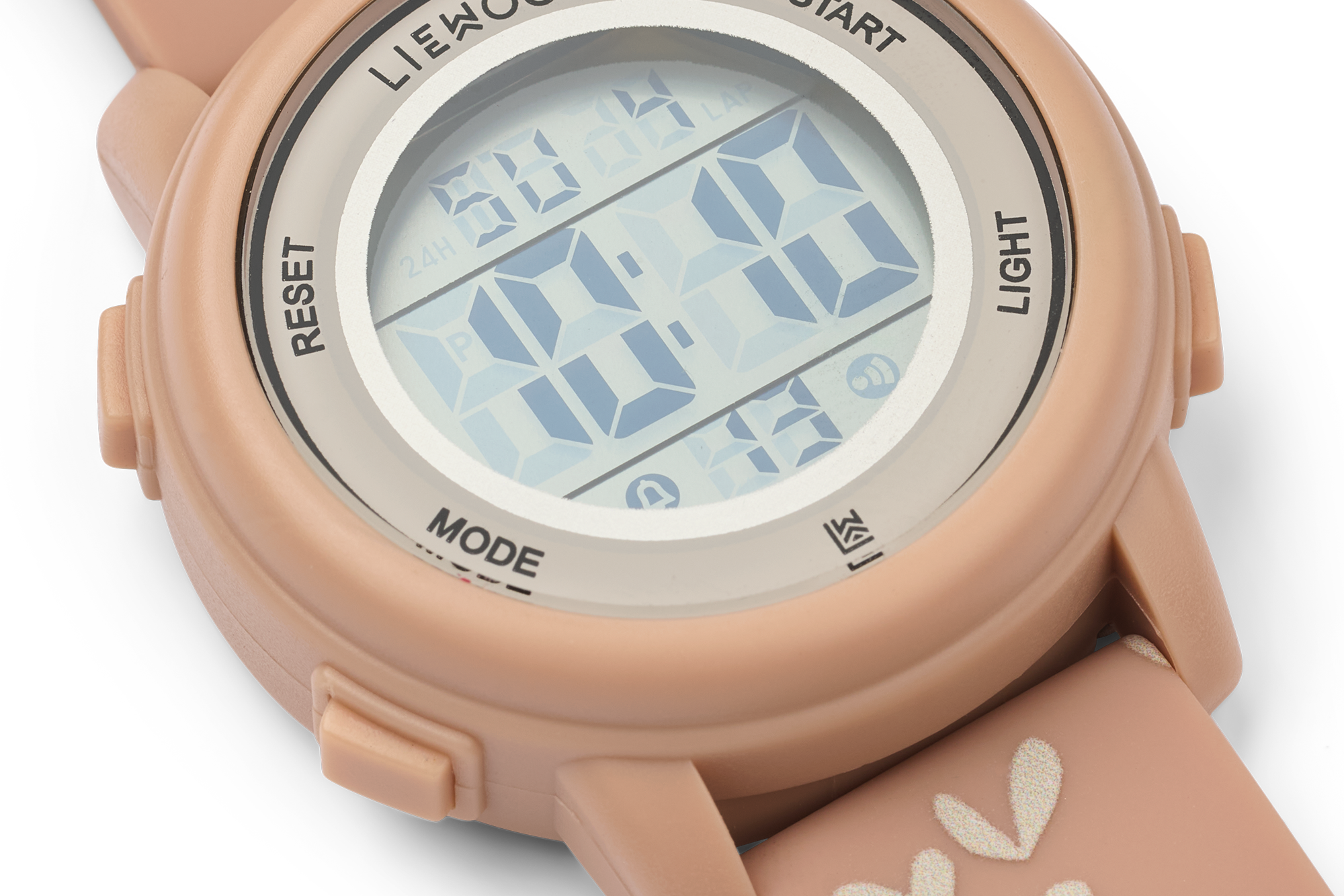 Com um alegre design com amorosos corações e uma bracelete de silicone resistente, este relógio Sussi, desenhado pela Liewood, é perfeito para as aventuras do dia a dia. Com um visor digital e de fácil leitura, este relógio irá garantir que o seu mini sabe as horas em qualquer lugar, pois é resistente à água e tem função de alarme. A bateria deste relógio é recarregável.