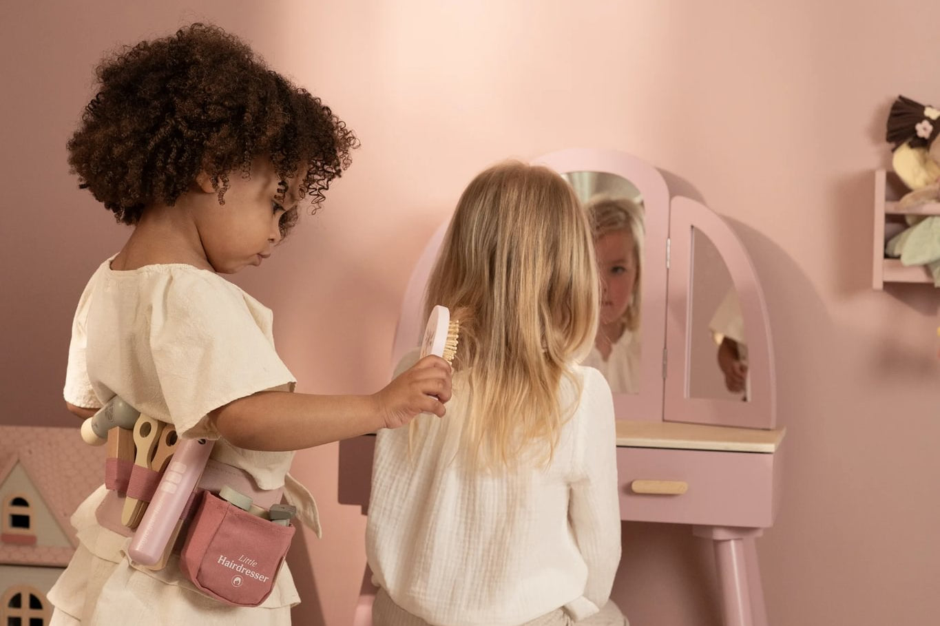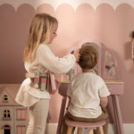 Corte, seque e penteie como um verdadeiro cabeleireiro, com este conjunto o seu mini irá tornar-se um cabeleireiro profissional! Com este lindo conjunto de cabeleireiro em madeira, o seu mini tem tudo à mão para criar os mais belos penteados. O cinto ajustável rosa está repleto de acessórios profissionais, como uma tesoura de brincar, um secador de cabelo,