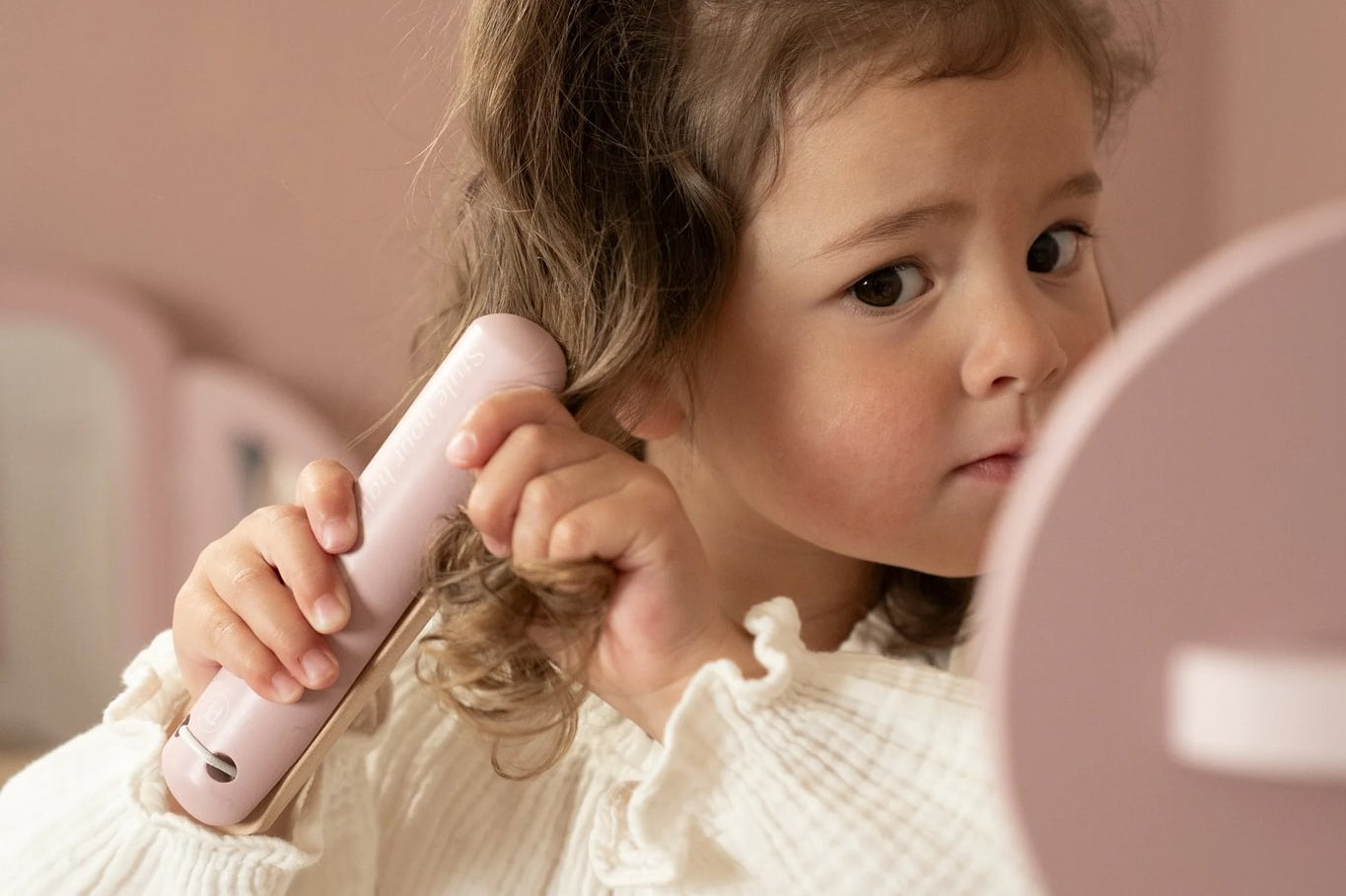 uma prancha, uma máquina de cortar cabelo, uma escova, champô, spray de cabelo e um espelho. Perfeito para brincadeiras de faz de conta e diversão sem fim. Quem será o primeiro a entrar no salão?