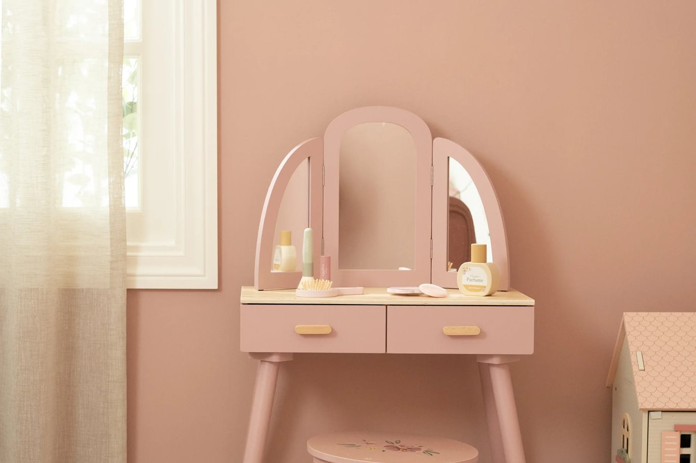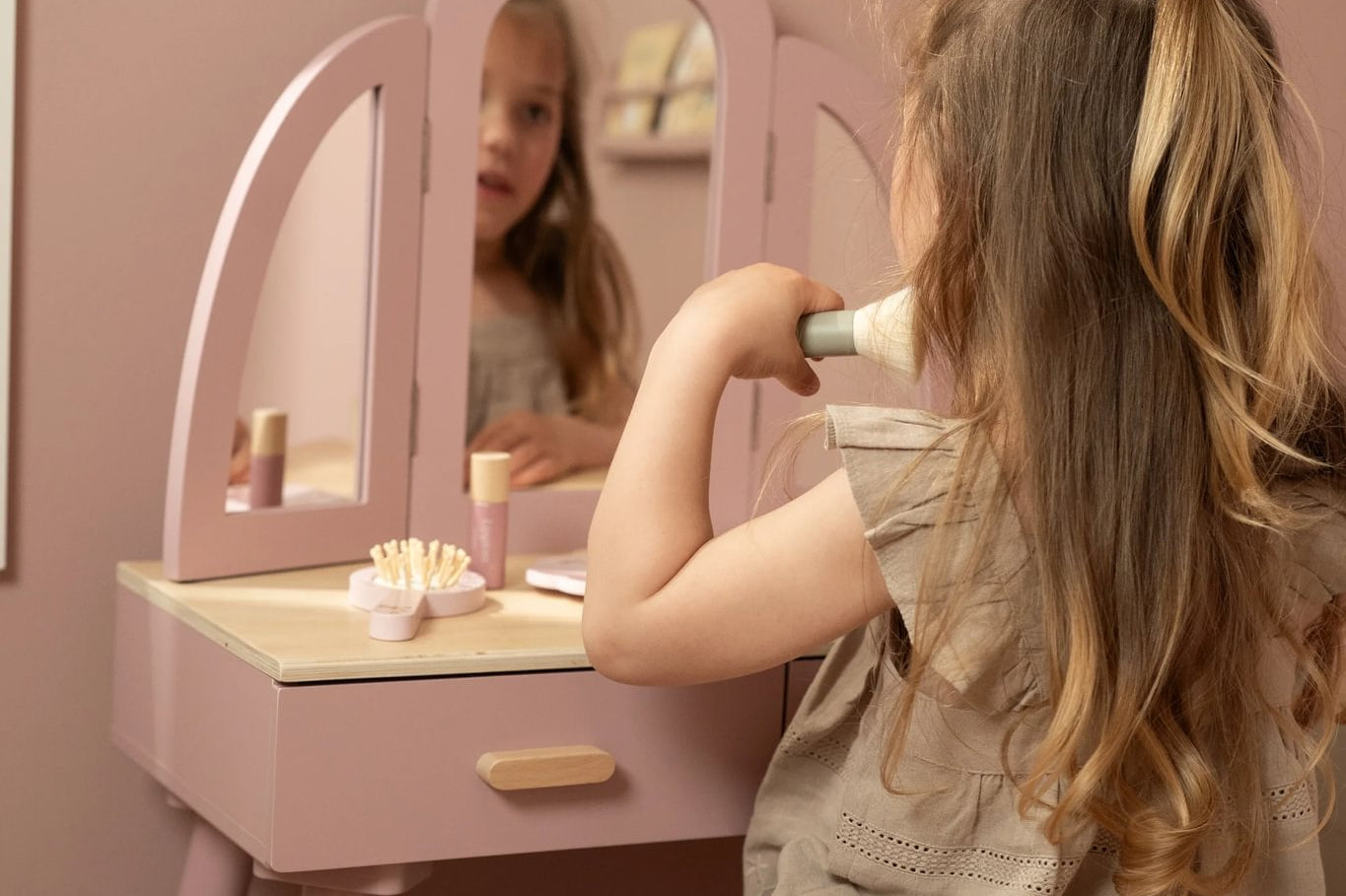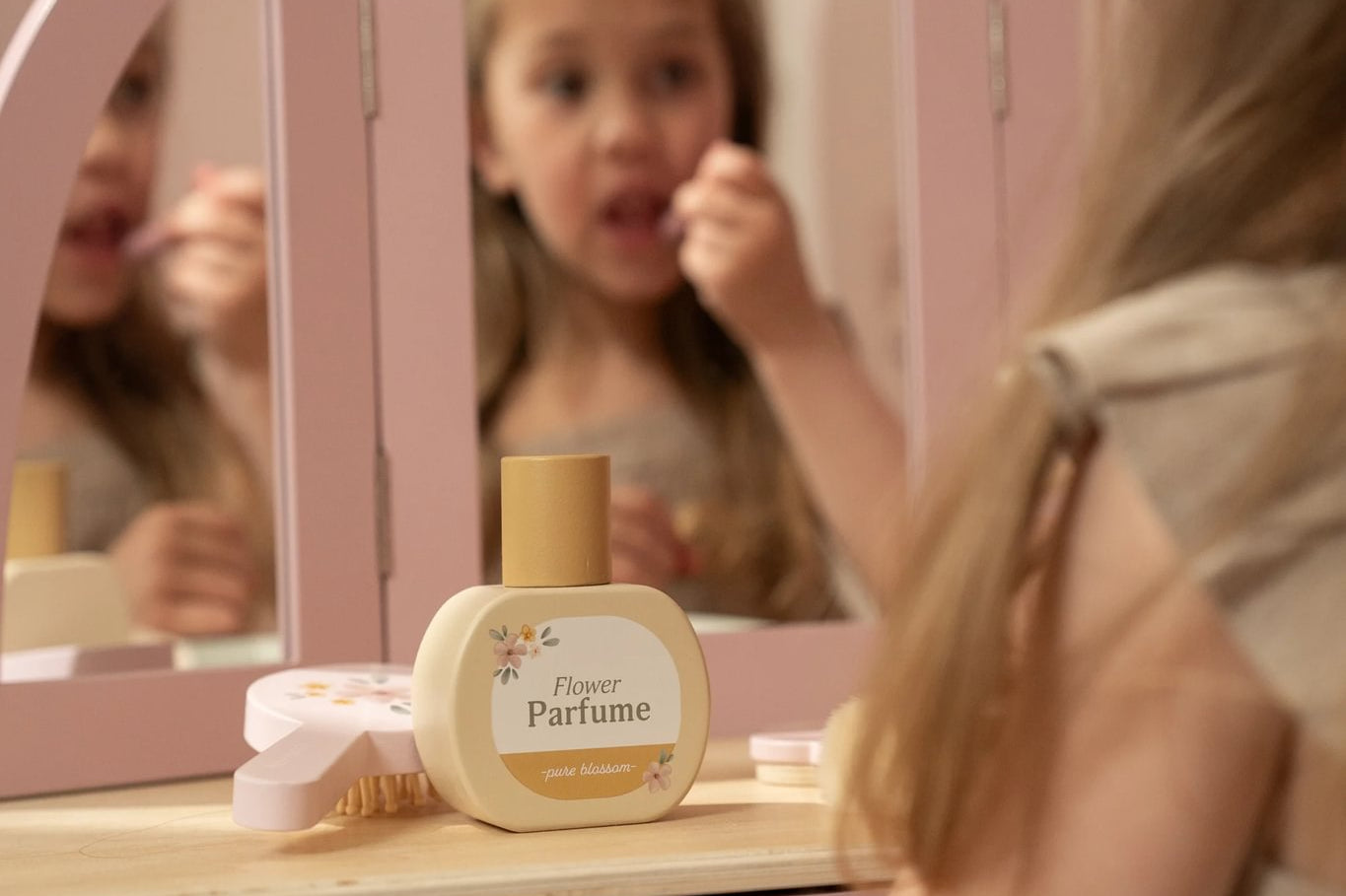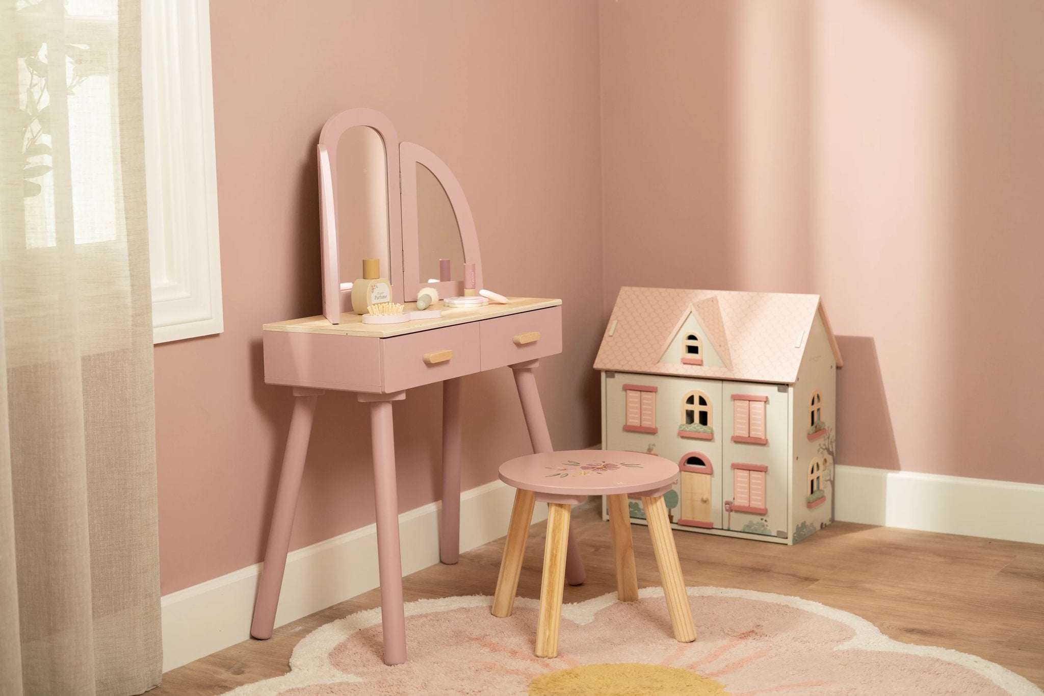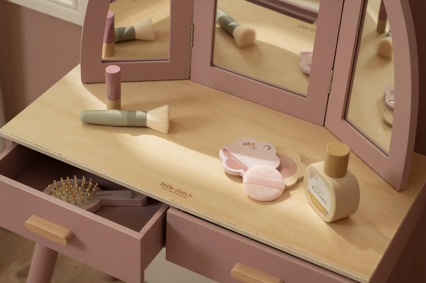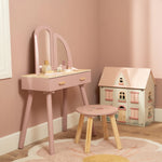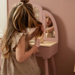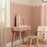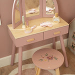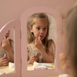 Com este bonito toucador de madeira em rosa suave as minis vão se sentir umas verdadeiras princesas! O elegante espelho de três painéis permite que a sua pequena se admire de todos os ângulos, enquanto as gavetas espaçosas oferecem espaço para todos os seus lindos acessórios. Inclui seis produtos de beleza em madeira e um encantador banquinho com uma ilustração floral. Perfeito para brincadeiras imaginativas e para imitar os adultos!