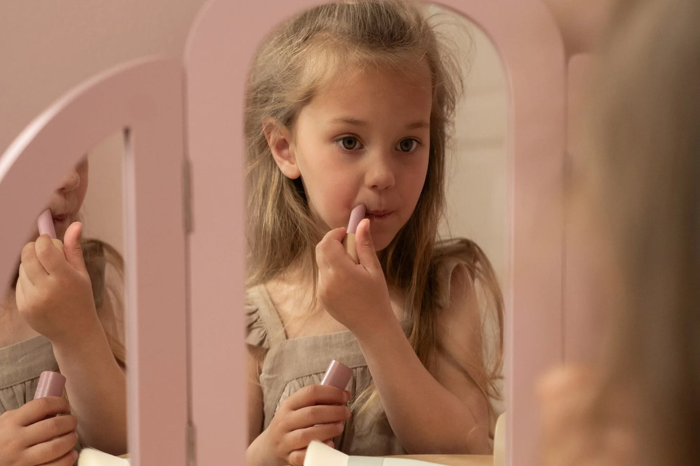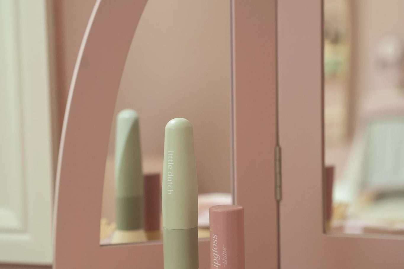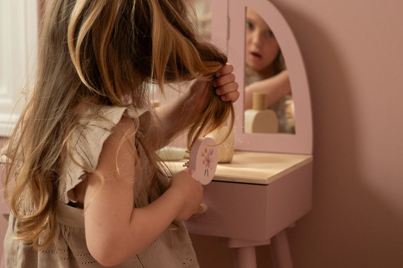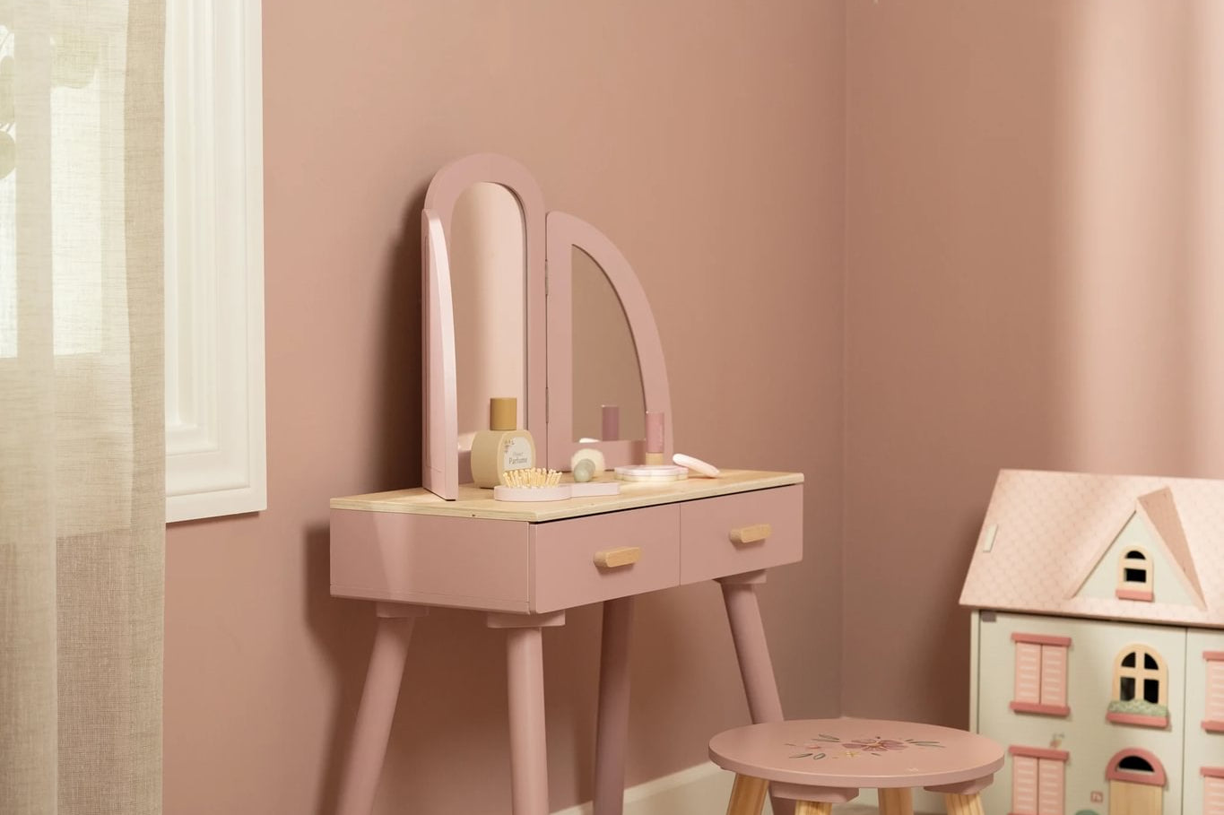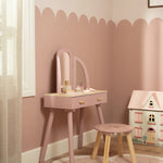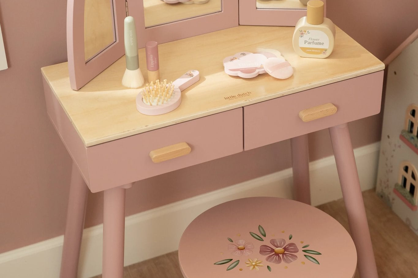 Com este bonito toucador de madeira em rosa suave as minis vão se sentir umas verdadeiras princesas! O elegante espelho de três painéis permite que a sua pequena se admire de todos os ângulos, enquanto as gavetas espaçosas oferecem espaço para todos os seus lindos acessórios. Inclui seis produtos de beleza em madeira e um encantador banquinho com uma ilustração floral. Perfeito para brincadeiras imaginativas e para imitar os adultos!